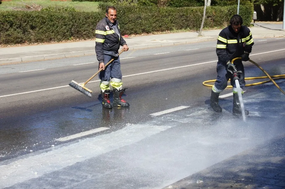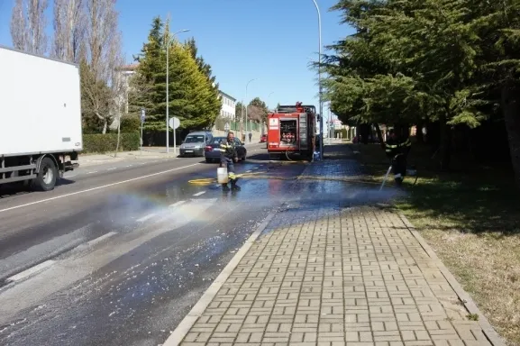 en torno al número 8 de la via, entre los institutos de educación secundaria. Debido a la peligrosidad de la grasa en la calzada, los bomberos acudieron al lugar para limpiar la zona. Se utilizó el agua de dos autobombas, así como arena y productos desengrasantes.