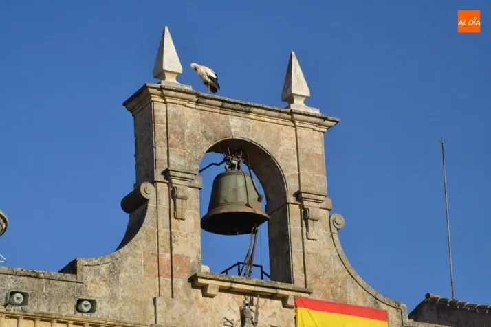 Durante la mañana del viernes la Plaza Mayor de Ciudad Rodrigo terminó de quitarse su disfraz carnavalero, volviendo a su tranquilidad habitual, que ejemplificó a la perfección durante la misma tarde la cigüeña que aparece en la imagen en lo más alto de la Casa Consistorial. Curiosamente, justo en esos momentos se estaba cumpliendo una semana exacta del momento de mayor ebullición de la Plaza Mayor con el Campanazo.