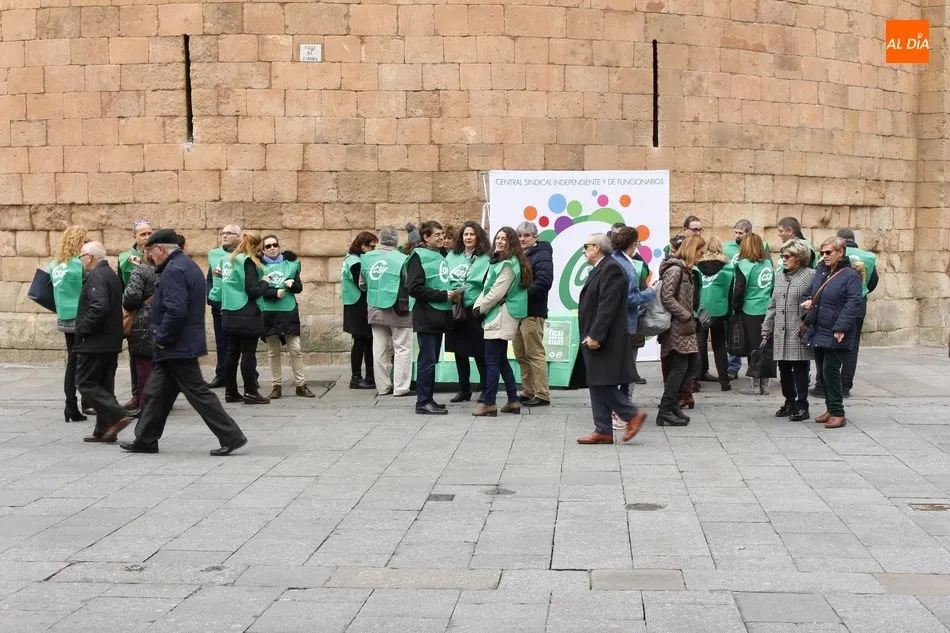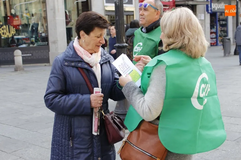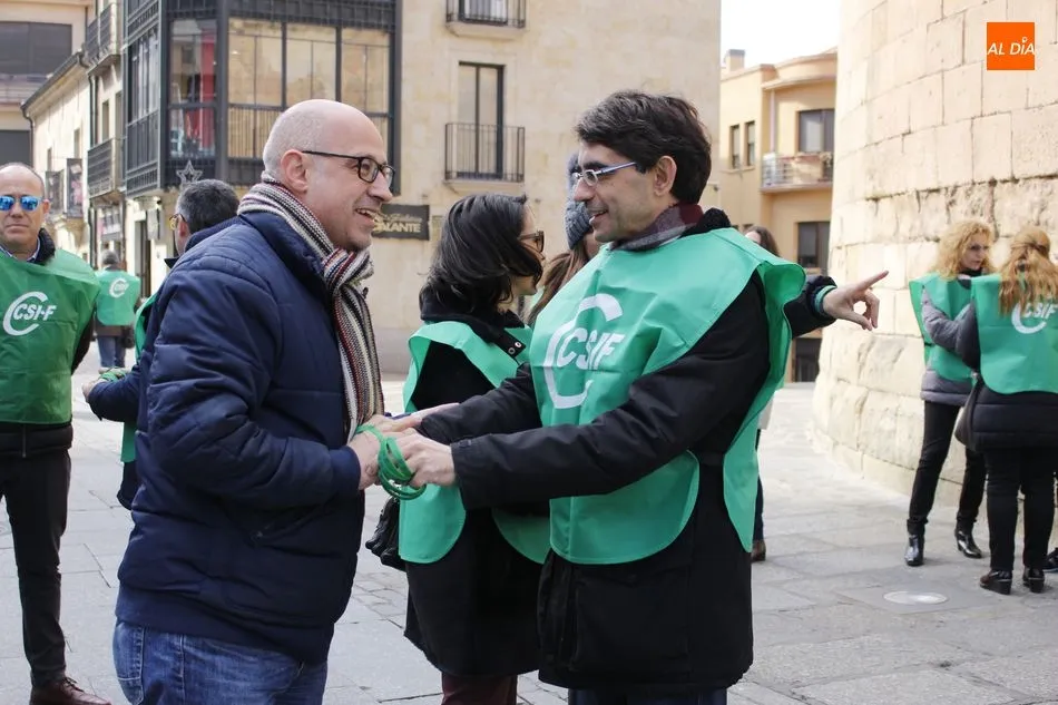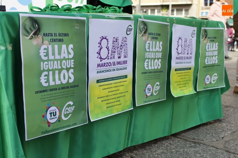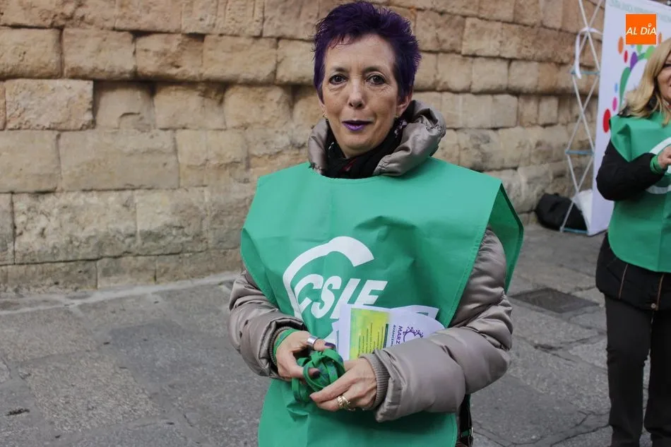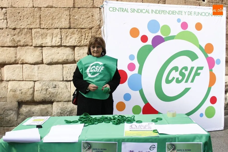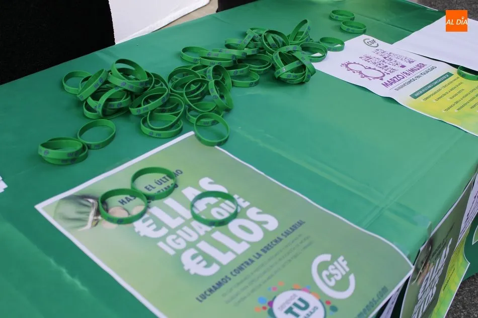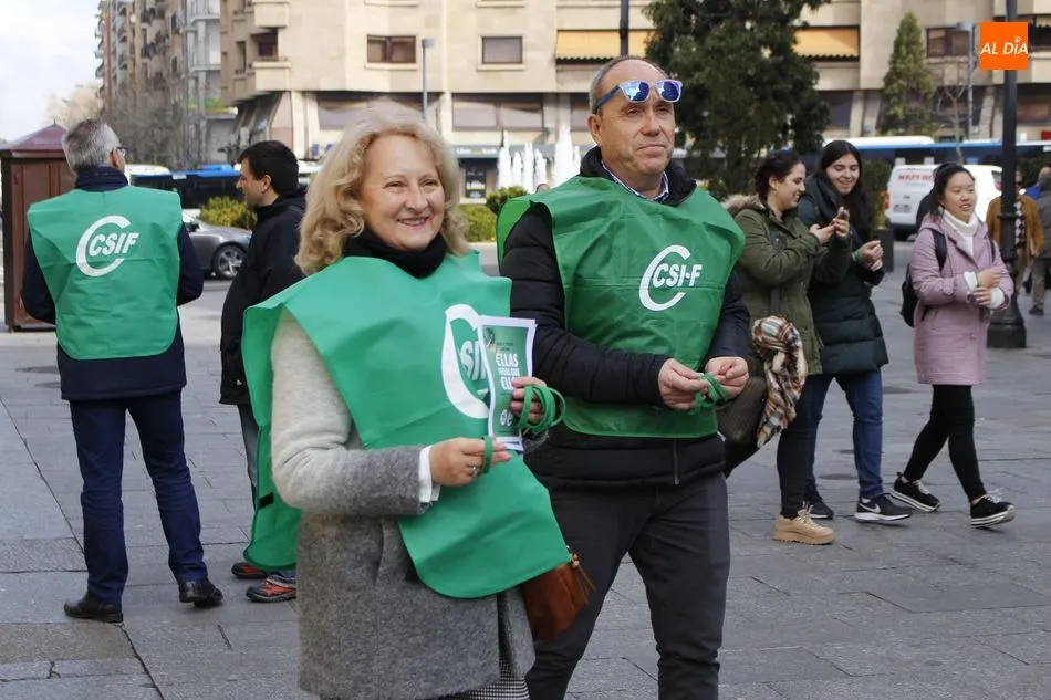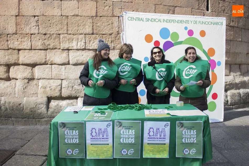 Coincidiendo con la huelga de una hora por turno que CSIF ha convocado en los centros de trabajo, este viernes 8 de marzo este sindicato llevaba a cabo una concentración en la calle Zamora, junto a la iglesia de San Marcos. Allí, los delegados de CSIF repartían entre los viandantes pulseras ?por la Igualdad real entre hombres y mujeres, para reivindicar un trato laboral igualitario y unas condiciones de trabajo dignas que no discriminen por sexo?.
