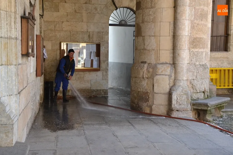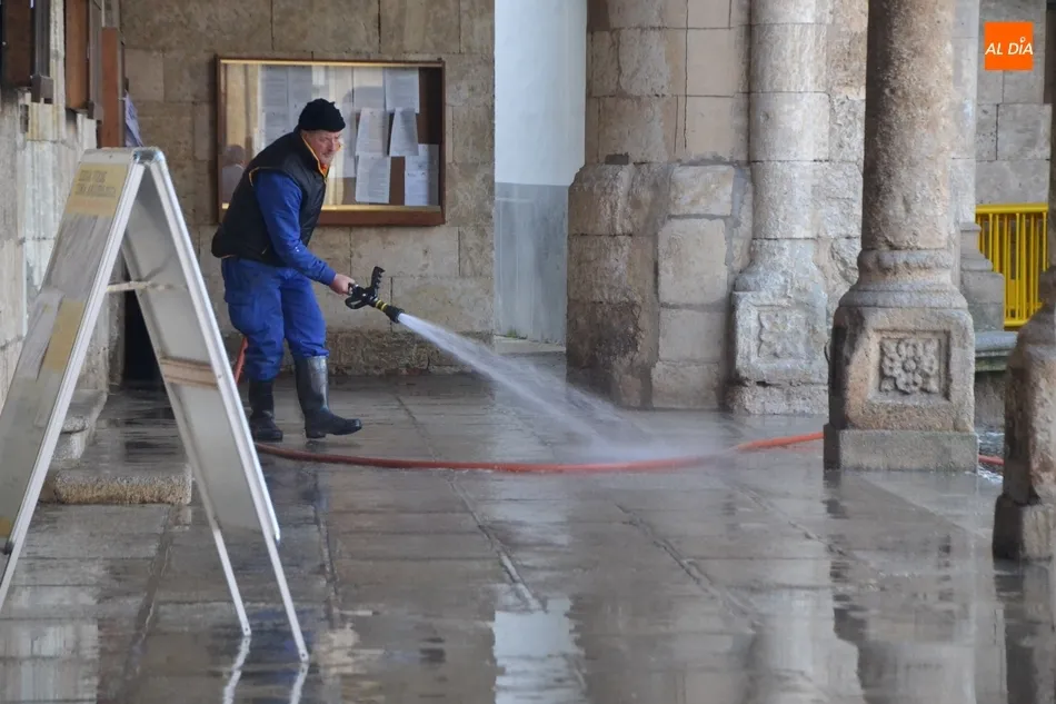 Una vez retirados todos los elementos, se comenzó a dar en los soportales de la Casa Consistorial el tradicional manguerazo de agua para dejar el ágora lo más limpia posible. Hay que apuntar que el ágora no se llegó a limpiar del todo en la mañana del viernes, quedando pendiente aproximadamente la mitad de la Plaza (del tramo donde estuvo el coso taurino).