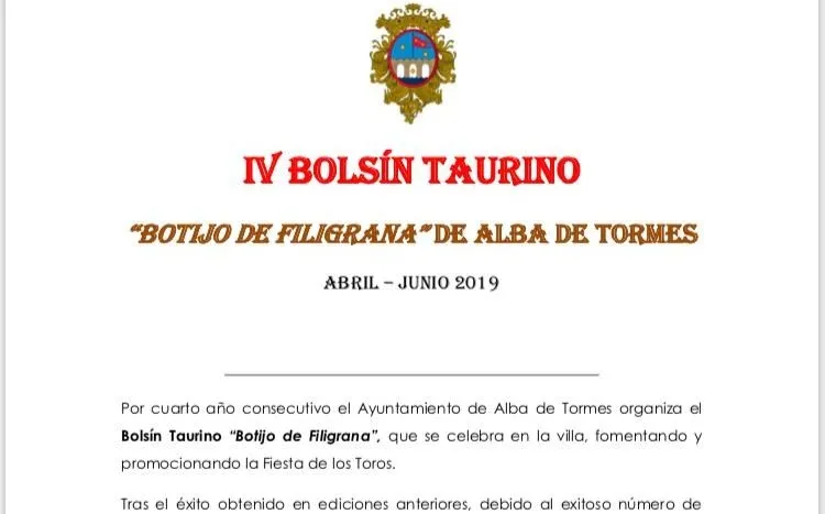 El Ayuntamiento de Alba de Tormes convocó ayer la cuarta edición del Bolsín Taurino Botijo de Filigrana y lo hizo apartando de su organización a la Asociación Taurina ?15 de Octubre?. Un mal gesto del Ayuntamiento porque la asociación taurina albense era hasta ahora organizadora y fundadora del certamen.