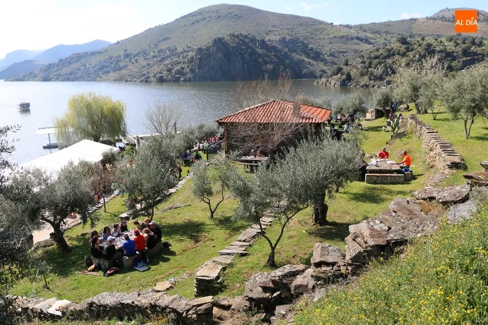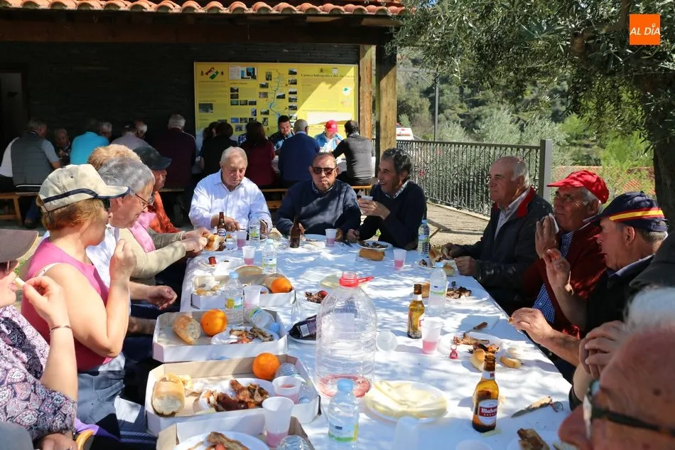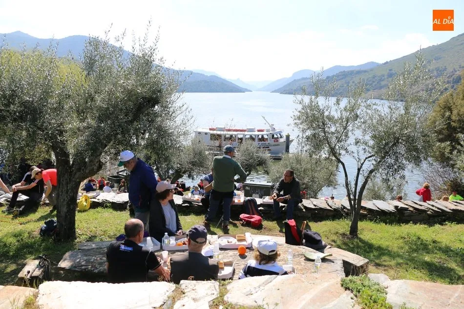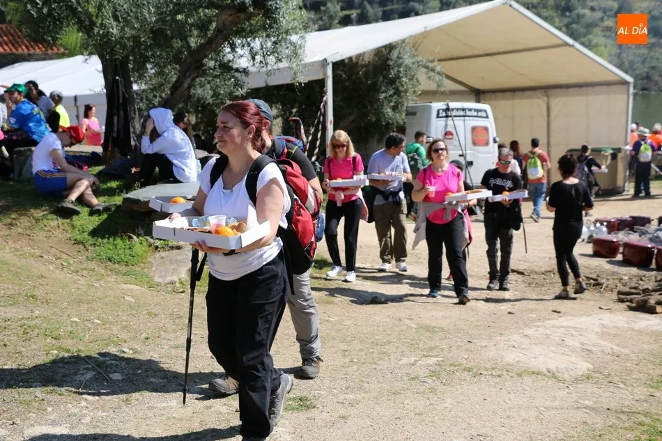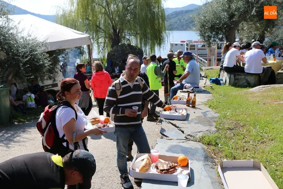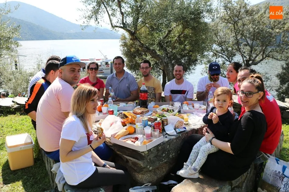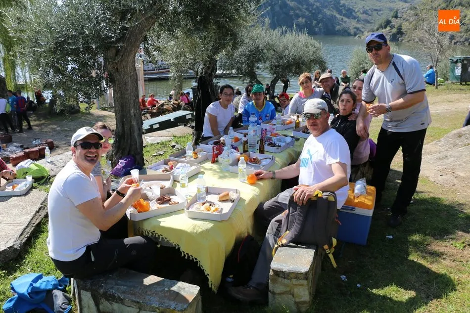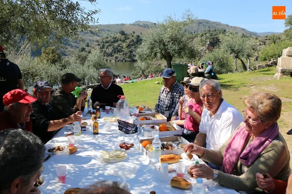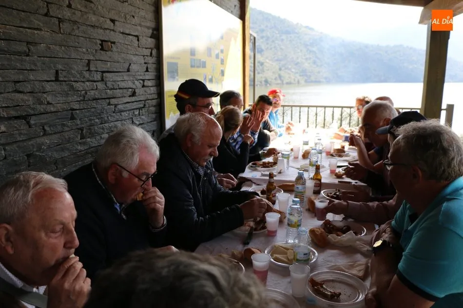 La ruta continuaba por el discurrir del Duero para adentrarse en el auténtico arribe y llegar al paraje de Las Torres, donde se encuentra un antiguo torreón que sirvió de vigía de la frontera. Desde este lugar los participantes se dirigían hacia la Cruz de los Baños y así poner ya destino a La Barca, paraje en el que les aguardaba una suculenta comida a base de asados de carne, chorizo, panceta y naranjas de Vilvestre, además de vino de La Ribera, café y aguardiente para animar la fiesta al son de la gaita y el tamboril.