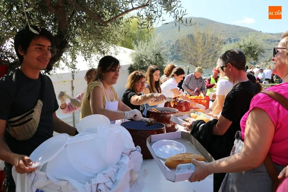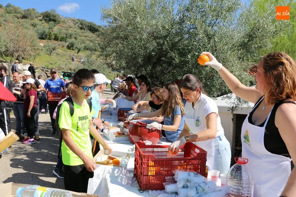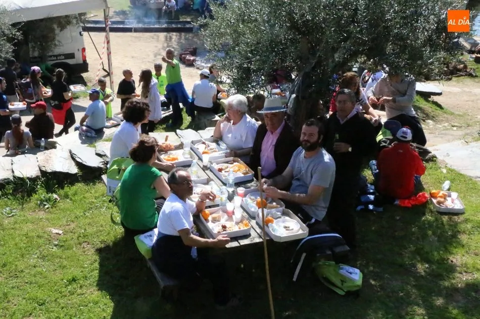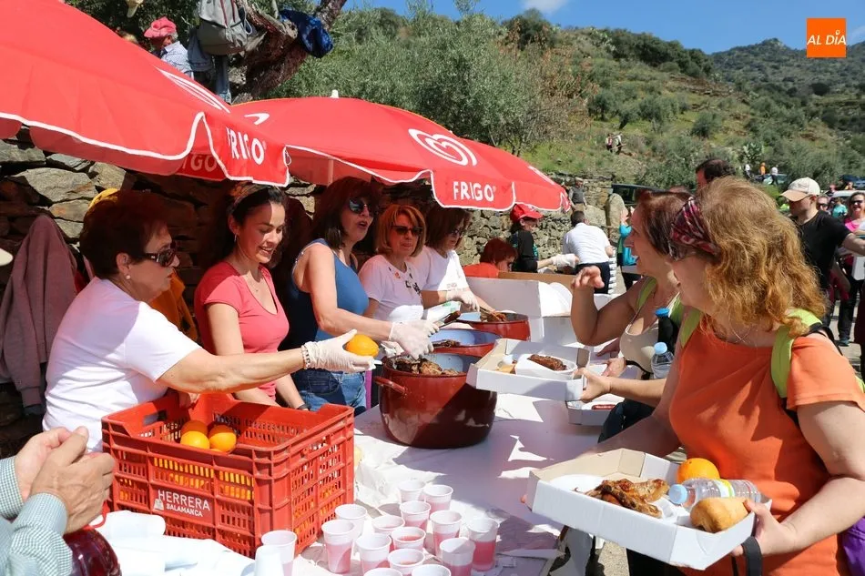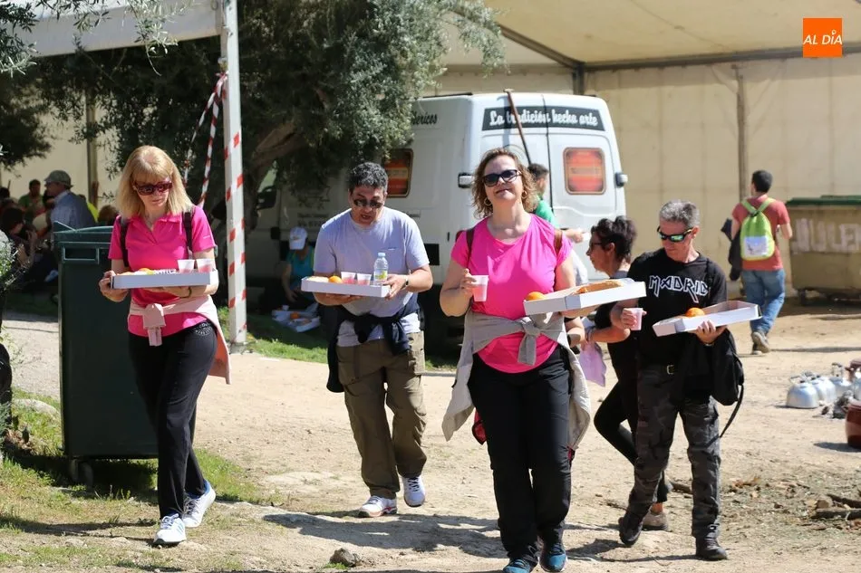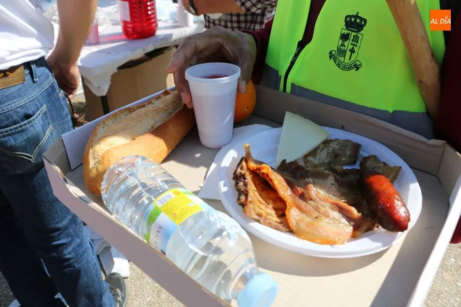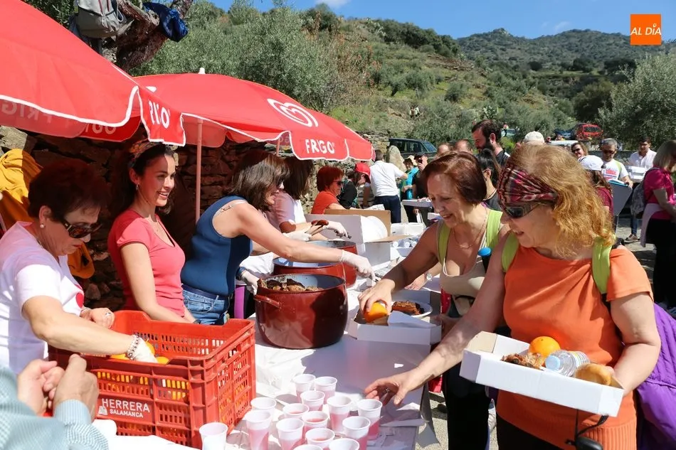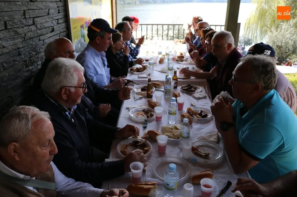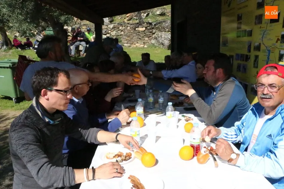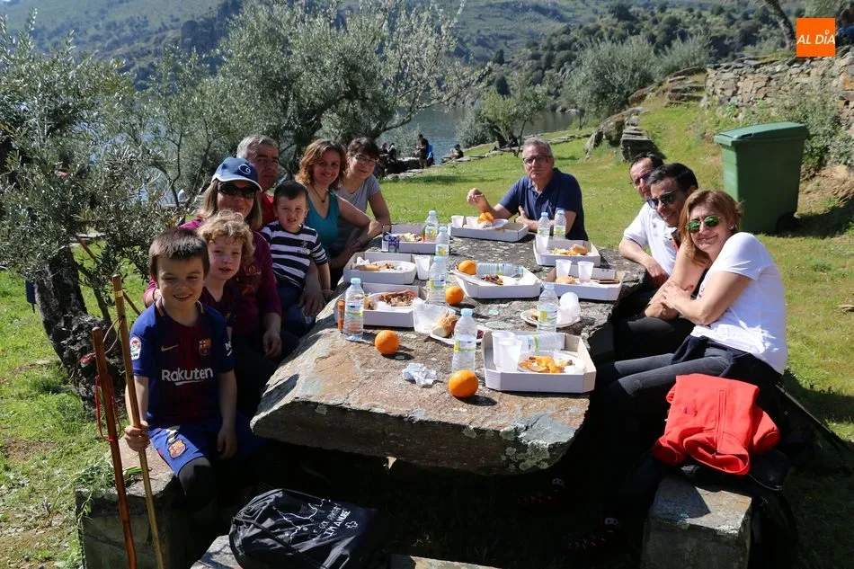 La ruta continuaba por el discurrir del Duero para adentrarse en el auténtico arribe y llegar al paraje de Las Torres, donde se encuentra un antiguo torreón que sirvió de vigía de la frontera. Desde este lugar los participantes se dirigían hacia la Cruz de los Baños y así poner ya destino a La Barca, paraje en el que les aguardaba una suculenta comida a base de asados de carne, chorizo, panceta y naranjas de Vilvestre, además de vino de La Ribera, café y aguardiente para animar la fiesta al son de la gaita y el tamboril.