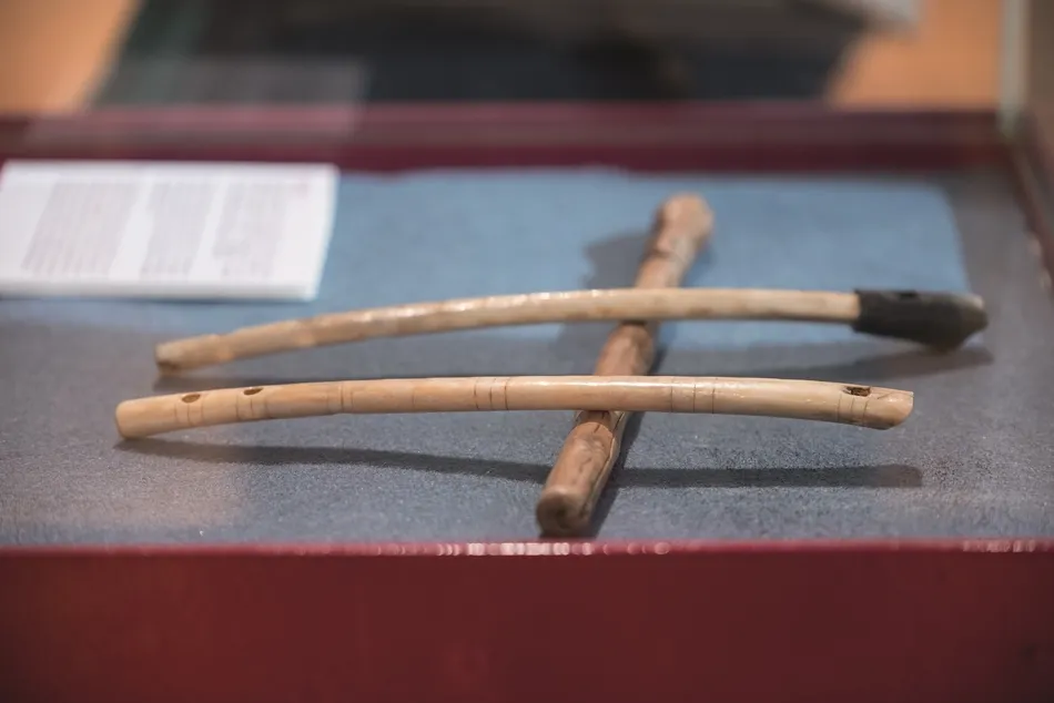 J.R.C.C.: Los tamboriles se hacen también con elementos reciclados, con un bidón, aros de cribas, el tronco de un cerezo? Cada tamborilero hacía el suyo y la porra de cada uno es diferente. En la exposición mostramos una gran variedad de piezas. Esta gaita está hecha con una cayada rota, esta otra la forraron con la piel de un bastardo, pero la más curiosa es esta flauta de ala de buitre, así las hay antiquísimas, descubiertas por la zooarqueología. Este hueso del pájaro, la ulna, es el equivalente al cúbito nuestro. Esta la tocaba el tío Rebulle. El buitre, un ave tan silenciosa, resulta curioso que haya generado los primeros instrumentos musicales de la historia del hombre. Mira si es importante el tamborilero que se decía: No hay olla sin tocino, Ni boda sin tamborino, Ni sermón sin agustino.