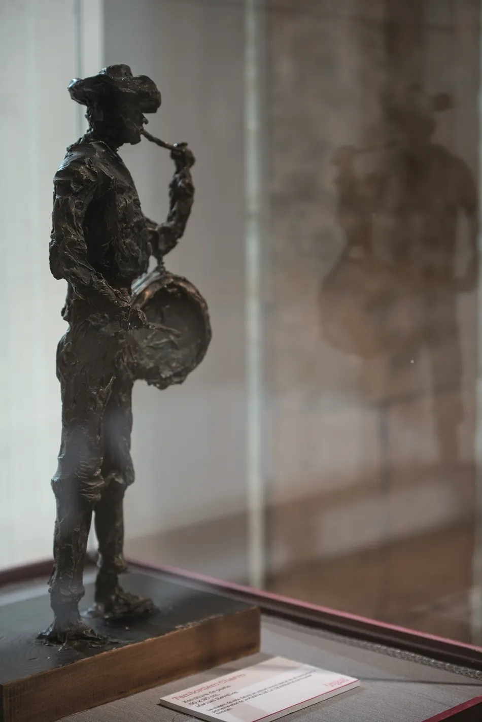 El sol de invierno ilumina las vitrinas donde castañuelas, gaitas, porras y panderos nos hablan de una forma de vida directamente unida a la tierra. Palos de danzar laboriosamente labrados, dibujos a punta de navaja, colores de la tierra para policromar el instrumento. Horas de soledad junto al ganado, es el impulso ancestral de hacer música con lo más cercano. Un charro lígrimo como dicen en la comarca de Vitigudino, enhiesto como en sus ropas de paño, tocando la gaita y el tamboril con esa rara apostura del salmantino de boto y de traje charro como los que pintan Jerónimo Prieto y Carlos García Medina, como los que recorre Florencio Maíllo en una serie que es un homenaje a estos músicos humildes, emblemáticos, curtidos en la labor y en la fiesta, estatua de Agustín Casillas y de Venancio Blanco. Los maestros del maestro Cid Cebrián, aquel que guarda sus instrumentos, los cuida, los muestra con el respeto y la reverencia de quien sabe valorar el tesoro de lo ancestral, la raíz de una tierra a ratos ingrata
