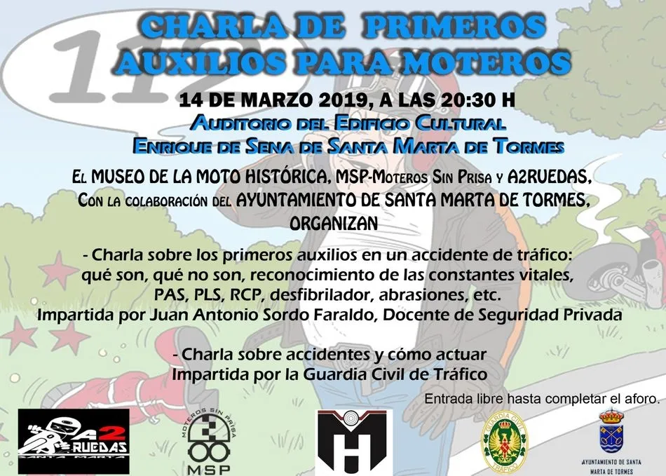 El Museo Moto Histórica, MSP y A2Ruedas, con la colaboración del Ayuntamiento de Santa Marta y la Guardia Civil de Tráfico, han organizado para este jueves una charla de primeros auxilios para moteros. Tendrá lugar a las 20.30 horas en el edificio cultural Enrique de Sena de la localida y la entrad es libre hasta completar el aforo.