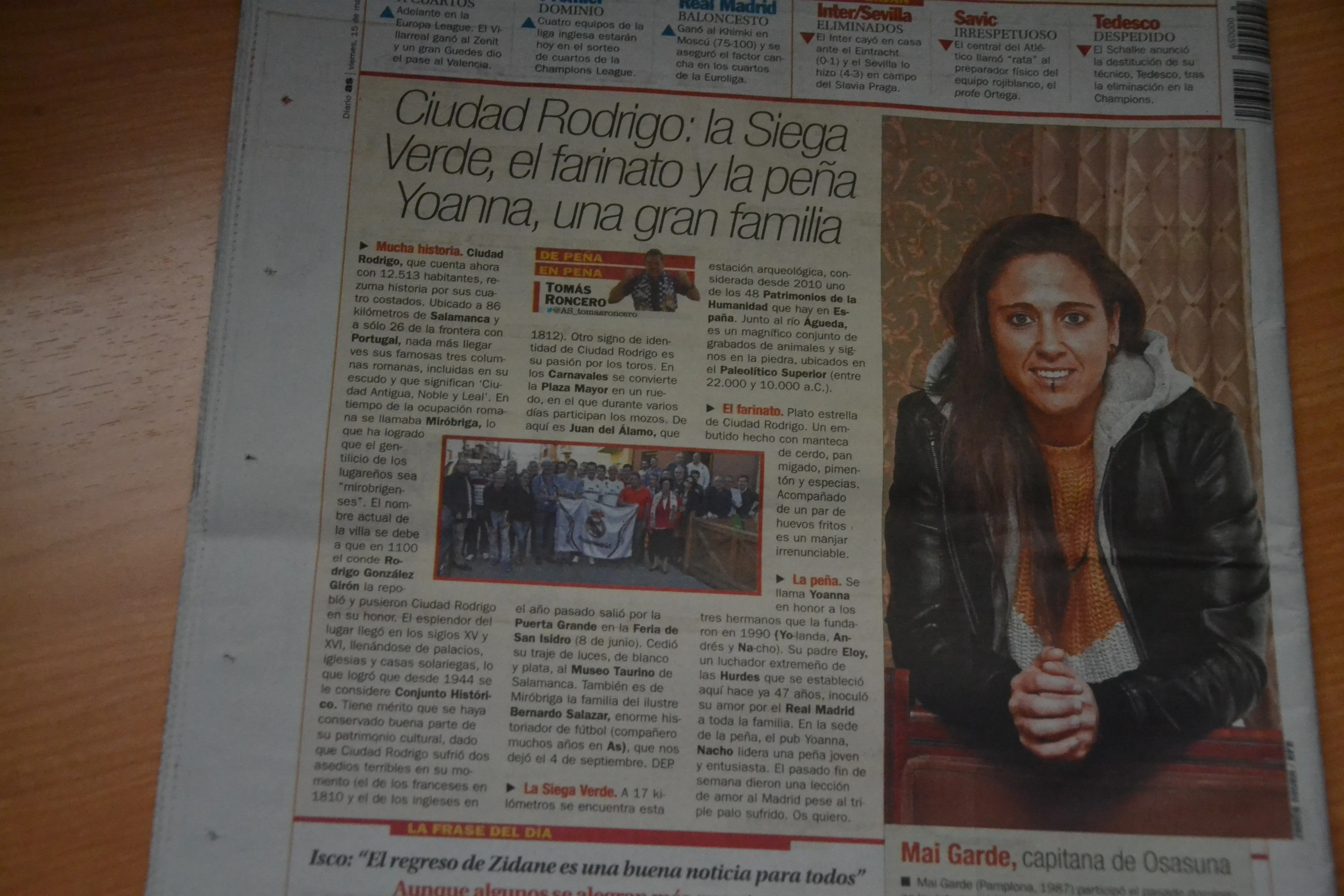 El Diario AS trae en la contraportada de su edición de este viernes 15 de marzo el esperado artículo del periodista Tomás Roncero sobre Ciudad Rodrigo tras la visita que hizo el pasado fin de semana a la ciudad por invitación de la Peña Madridista Yoanna. El artículo se titula concretamente Ciudad Rodrigo: la Siega Verde, el farinato y la peña Yoanna, una gran familia, y en el mismo Tomás Roncero va tratando los asuntos que incluye el propio titular.