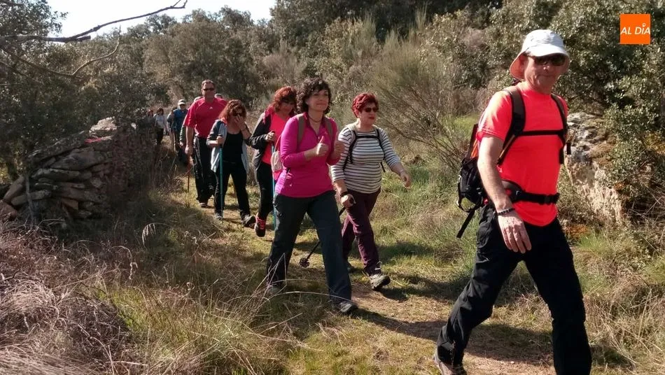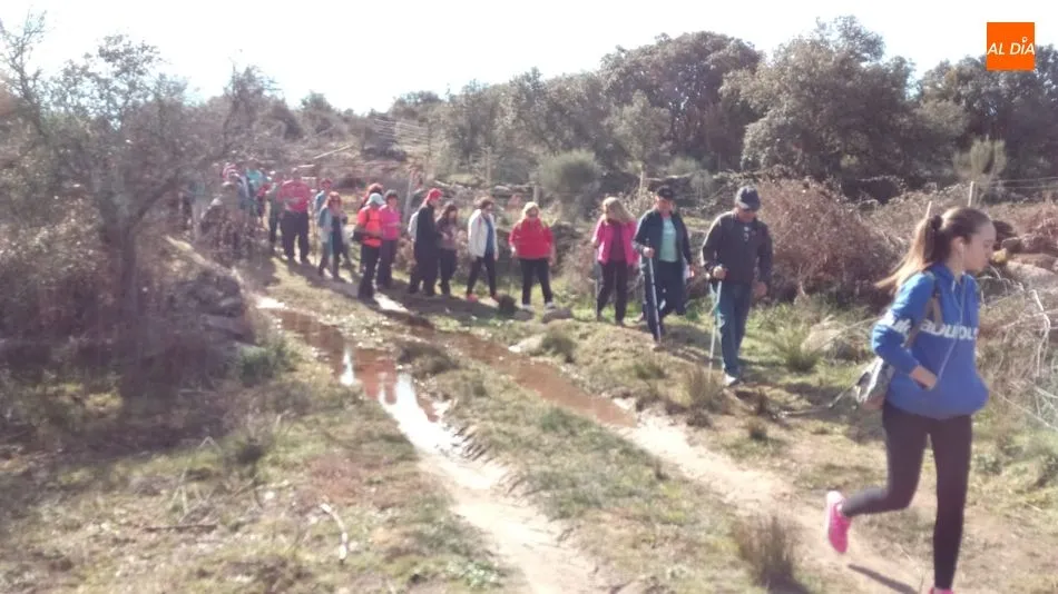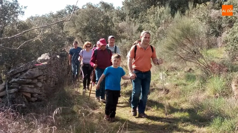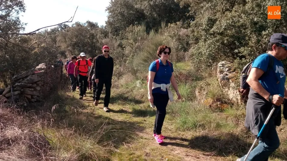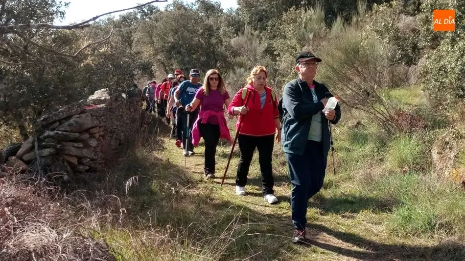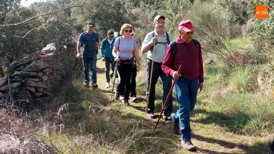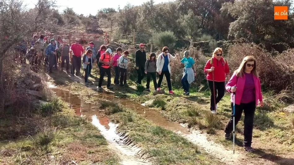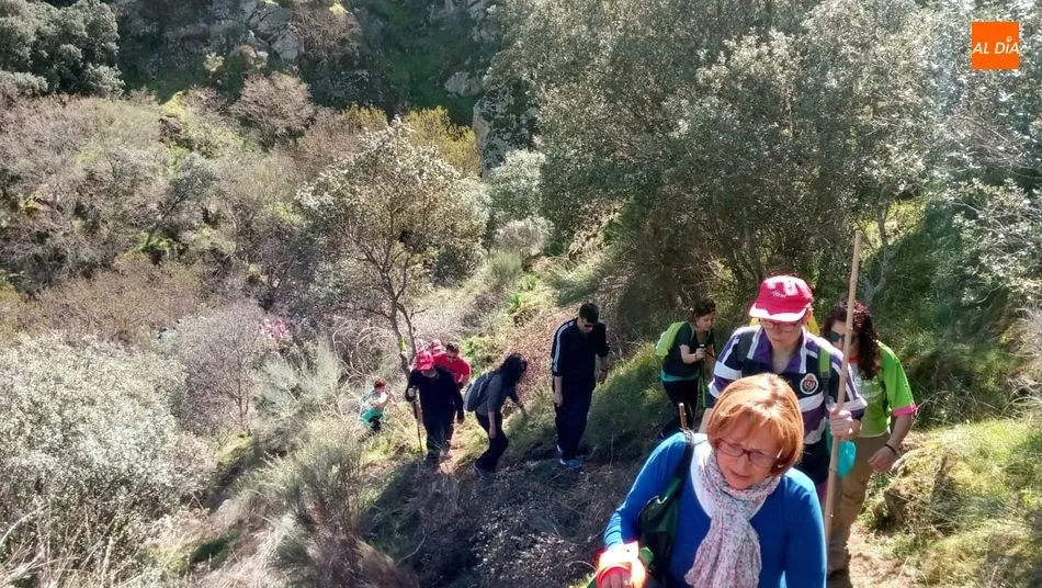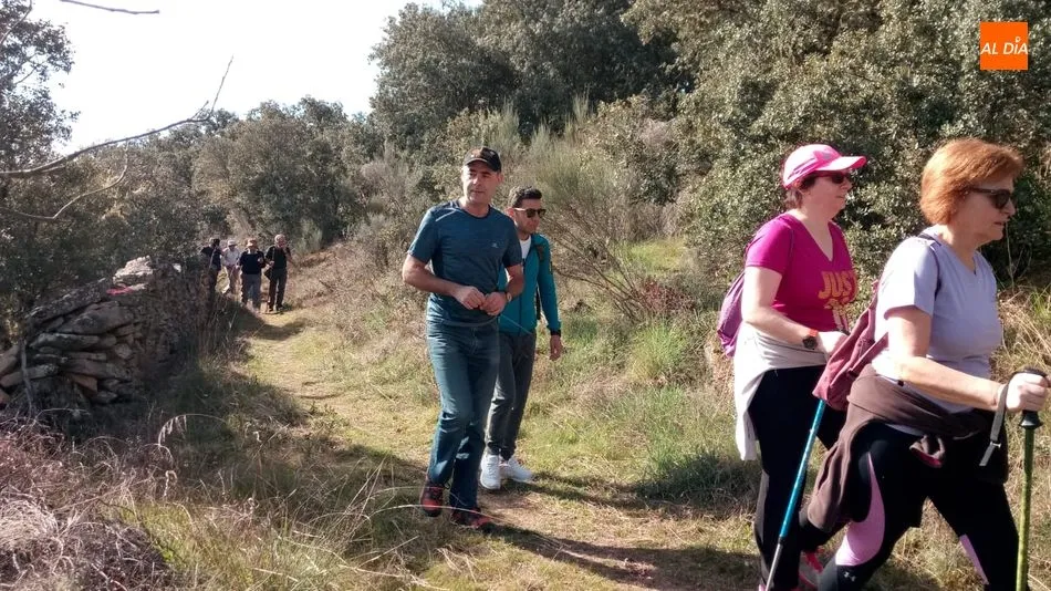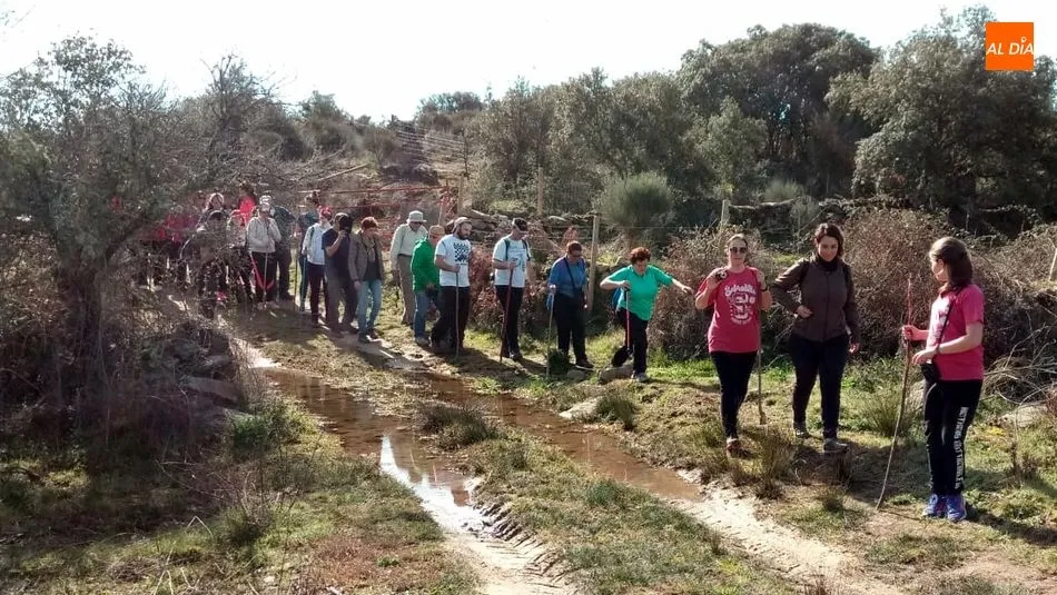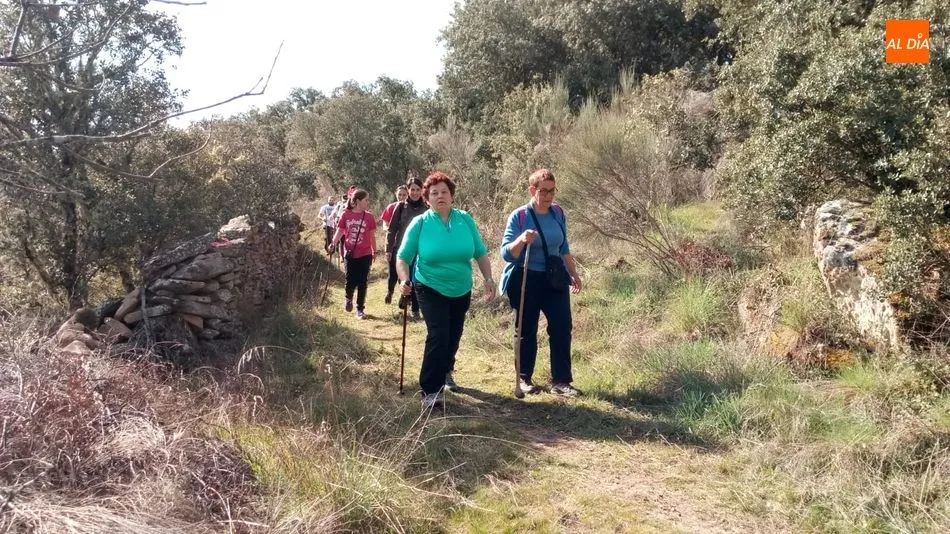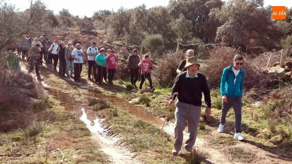 Los senderistas partieron a las 10.00 horas desde la Plaza de la localidad dispuestos a caminar durante más de cuatro horas en una agradable mañana de primavera, por caminos entre encinas y júmbrios y escobas rebosantes de color. Después de cruzar un regato, tomaron la senda del GR-14.1 (senda del Águeda) hasta llegar a la Vega del Morgáez. En la ribera de este río aún se conservan las construcciones de molinos y chozos en los que molturaba el trigo, aprovechando la fuerza motriz del agua.