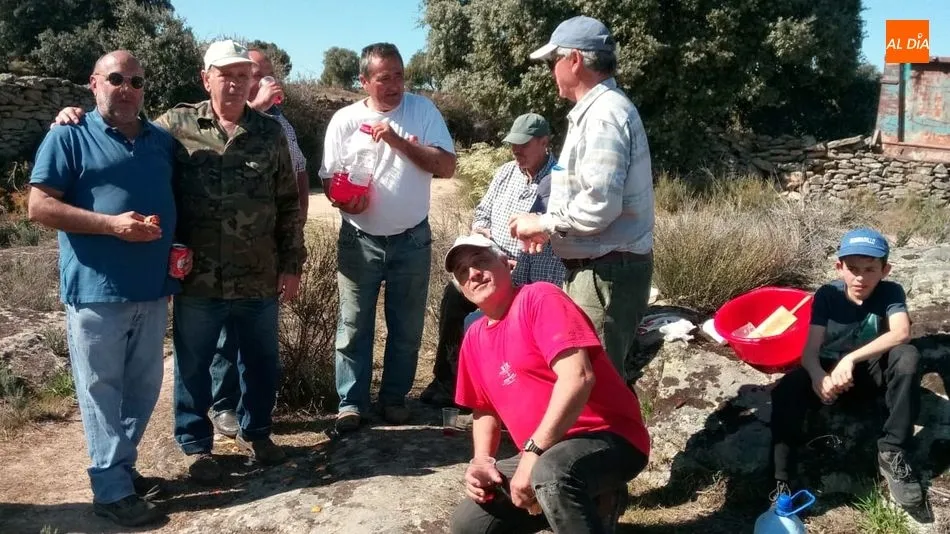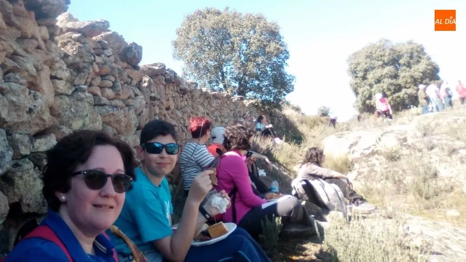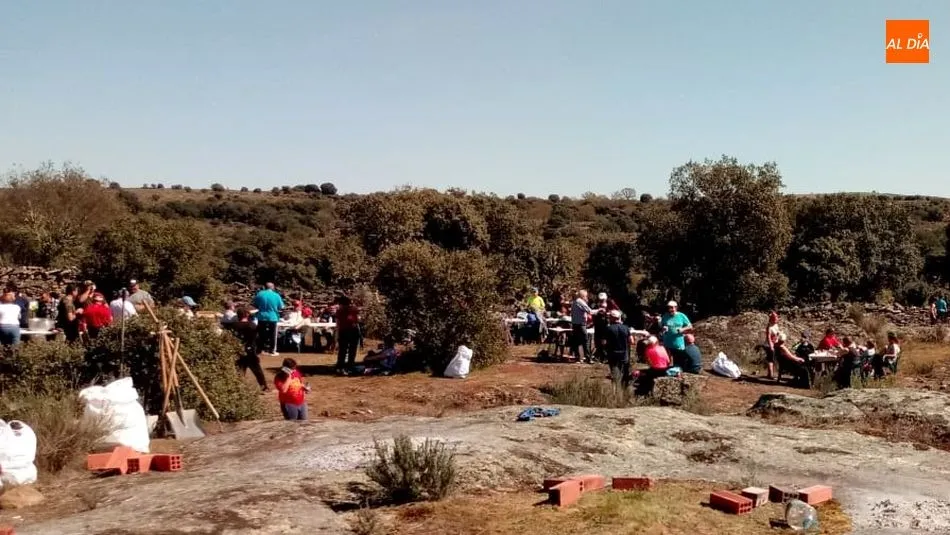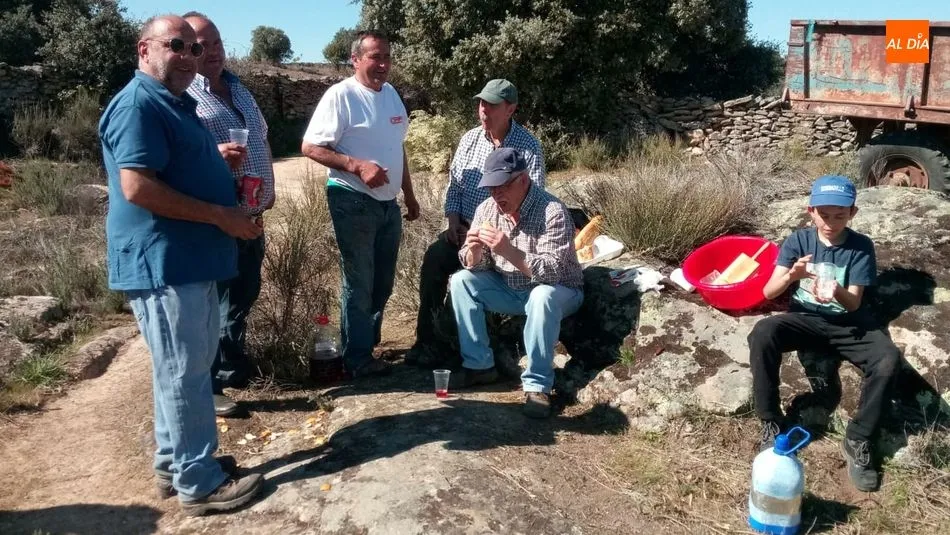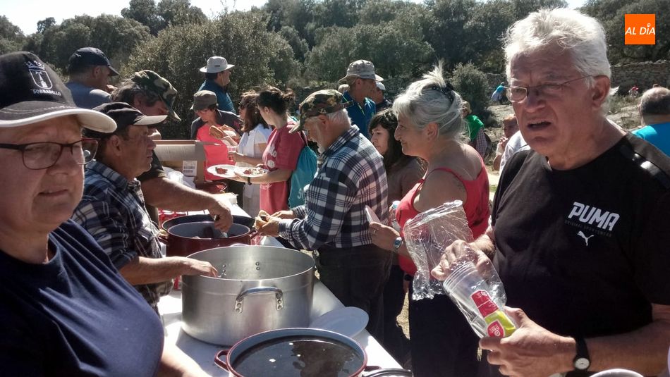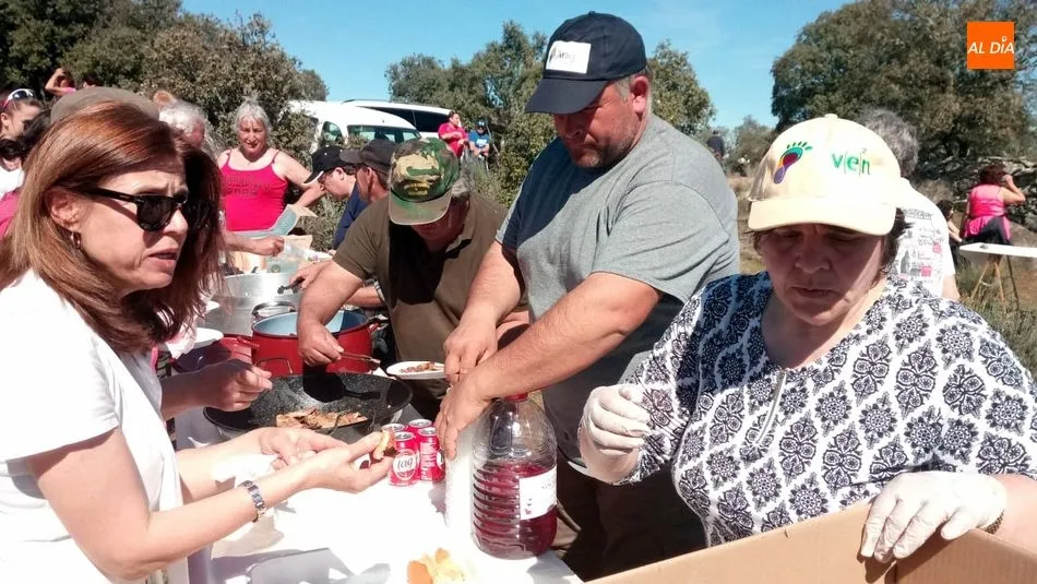 En el camino de regreso, por una empinada pista, ya al mediodía, se hizo un descanso en la ruta, en el paraje de La Cruz de San Martín, para la comida campestre. Los senderistas recuperaron fuerzas con un menú a base de panceta, cabecero de lomo y chorizo asados, bebidas, naranjas, café y rosquillas de sartén.