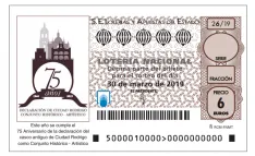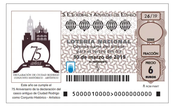 La Sociedad Estatal de Loterías y Apuestas del Estado ya tiene a la venta los décimos de la Lotería Nacional dedicados al 75 Aniversario de la Declaración de Ciudad Rodrigo como Conjunto Histórico-Artístico. Estos décimos serán los protagonistas del Sorteo del sábado 30 de marzo, justamente un día después de la fecha exacta del aniversario de la Declaración.