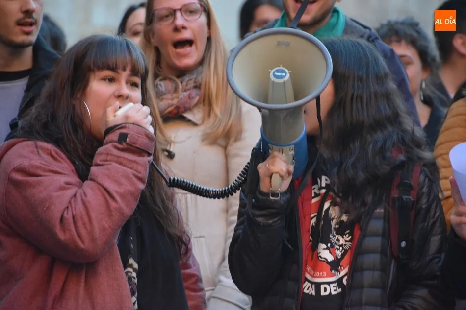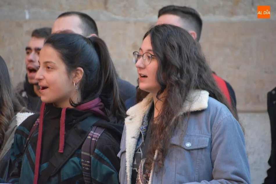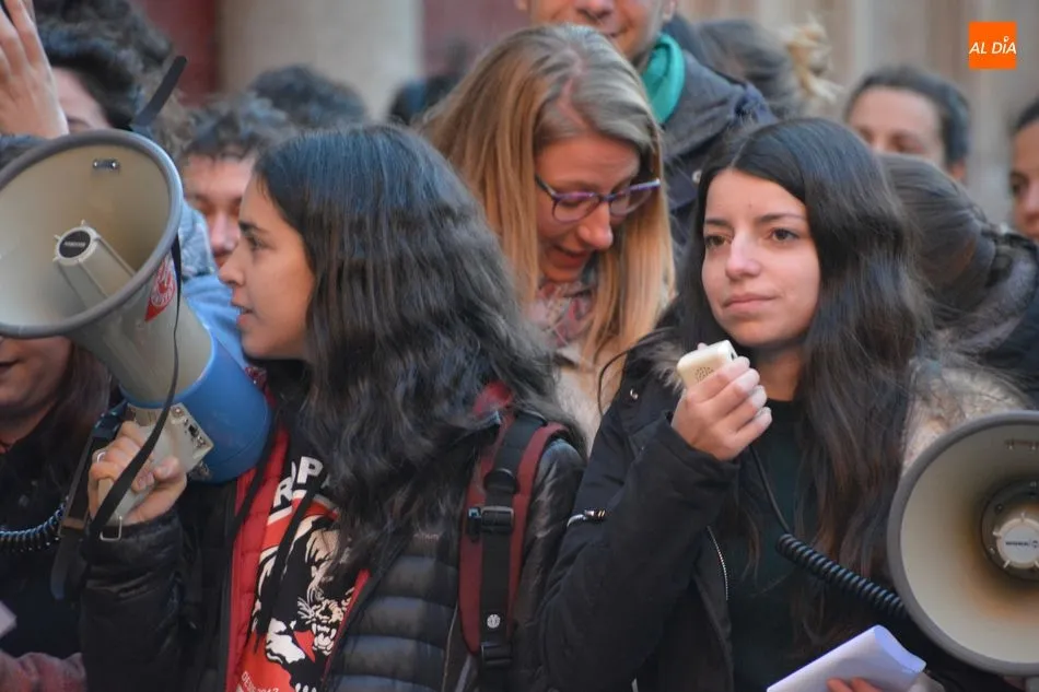 Miembros de la plataforma USAL Decide, que agrupa una veintena de asociaciones estudiantiles, feministas, vecinales, partidos y personas a título individual, se han concentrado este jueves en el Patio de Escuelas ?por la libertad de expresión en la USAL y contra la censura?.