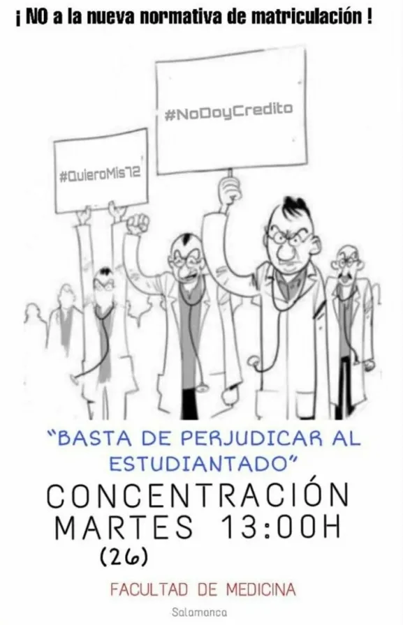 La Asamblea Solución 62 ECTS de Medicina y Odontología de la Universidad de Salamanca ha convocado una concentración de protesta para el próximo martes, día 26 de marzo, a las 13:00 horas, en la puerta de la Facultad de Medicina y Odontología.