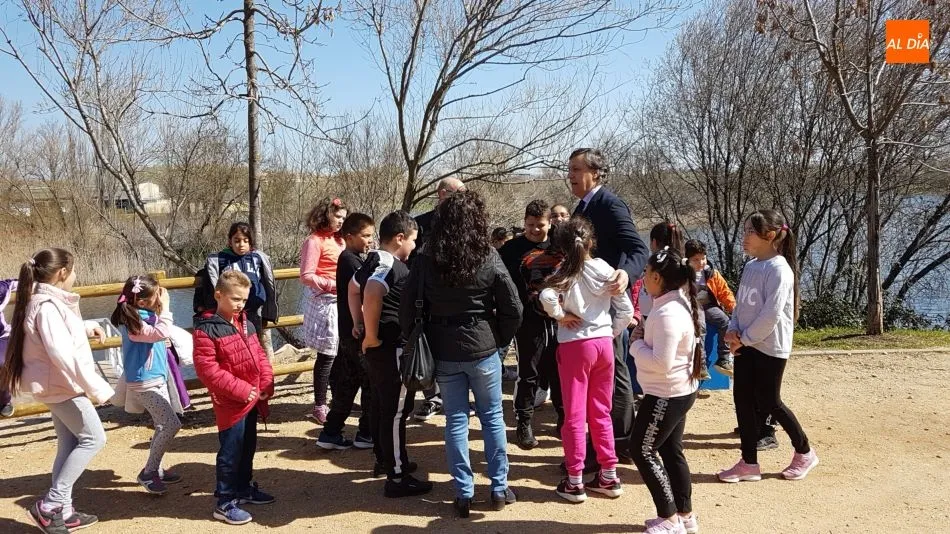 Con motivo del Día Mundial del Agua, celebrado el pasado viernes, el alcalde de la ciudad, Carlos García Carbayo, ha participado este lunes en una actividad medioambiental, junto a la Antigua Fábrica de la Luz, en el barrio de Tejares, dirigida a un grupo de escolares de 2º, 3º y 4º de Primaria del colegio Lazarillo de Tormes.
