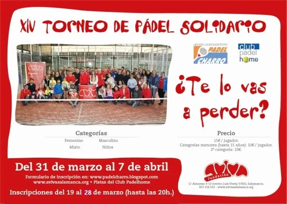 El formulario de inscripción se puede encontrar en www.padelcharro.blogspot.com, en www.avivasalamanca.org y, presencialmente, en las pistas del Club Pádel Home. Las categorías de participación son femenina, masculina, mixta y niños.
