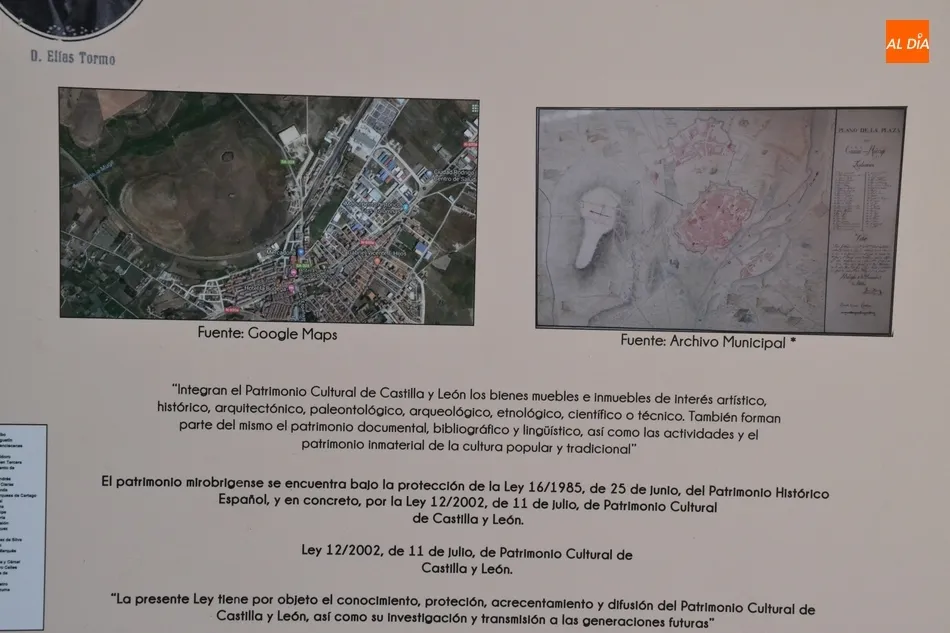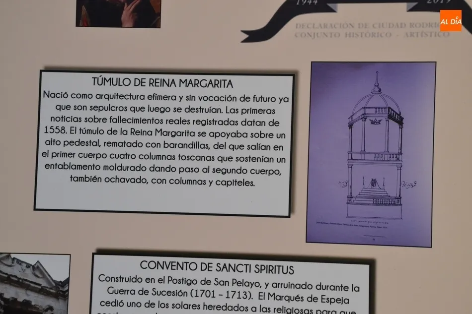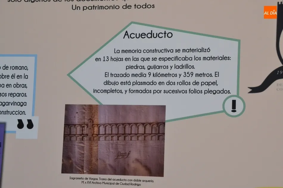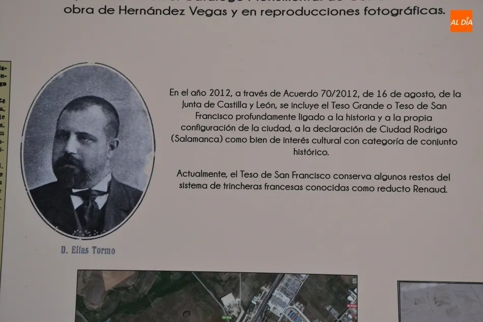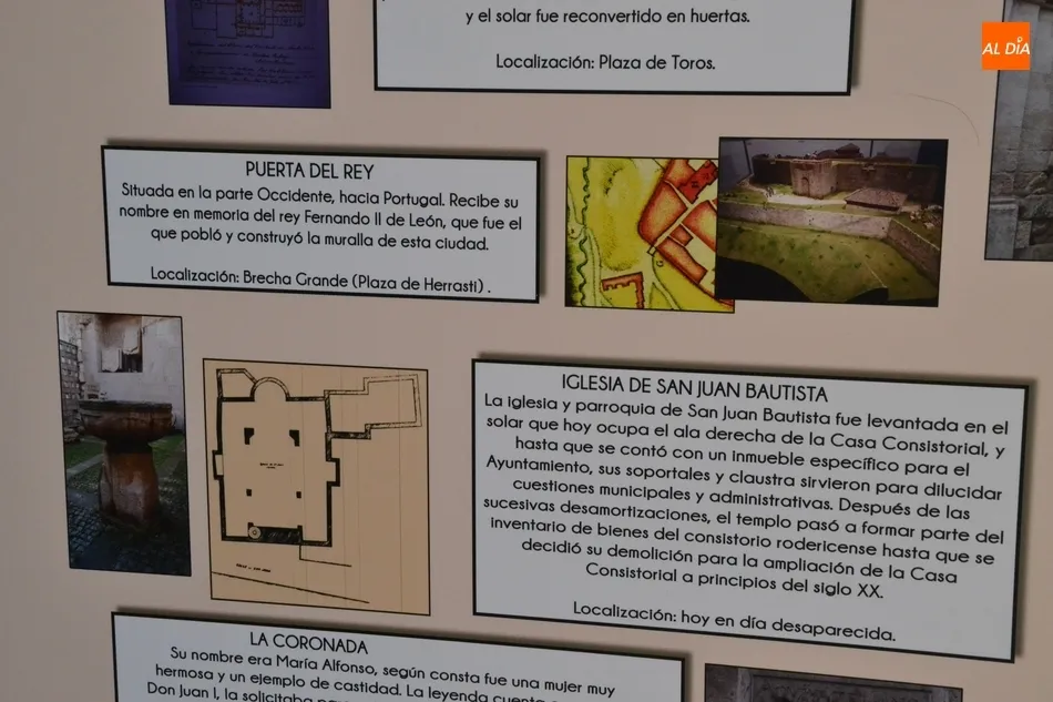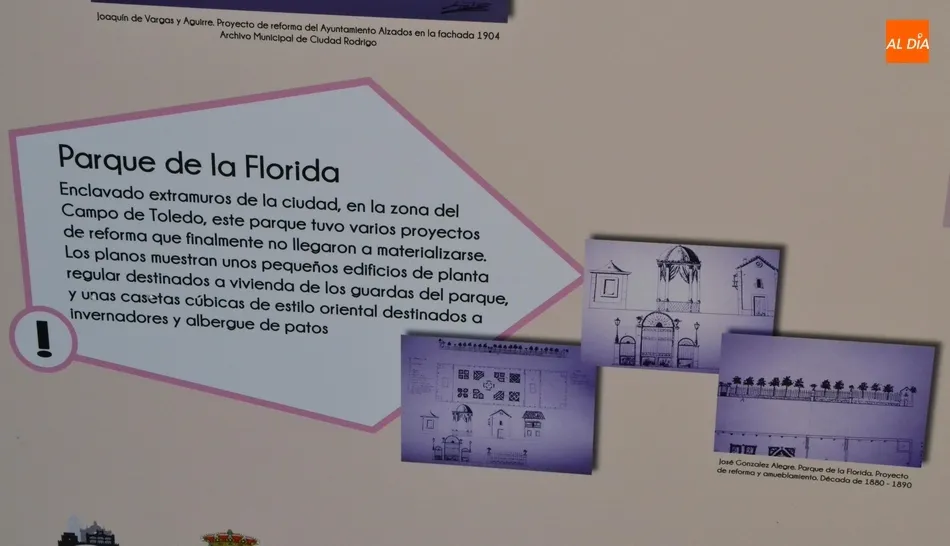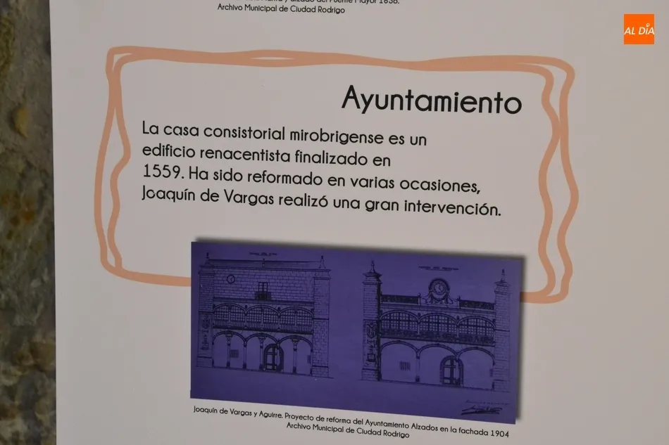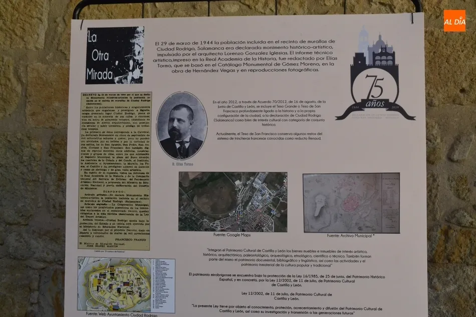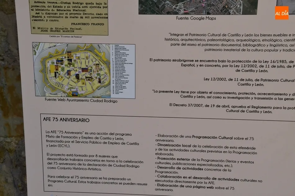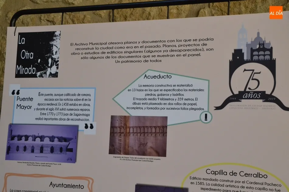 Por un lado, en el patio del Palacio se han colocado 4 paneles con distintos elementos procedentes de archivos. En el primero, se recoge el Decreto de la Declaración como Conjunto Histórico-Artístico, hablando además de uno de sus impulsores, Elías Tormo (también se explica en ese panel cómo funciona la AFE 75 Aniversario). En el segundo, se presentan planos rescatados de los archivos de distintos lugares de Ciudad Rodrigo, como el Puente Mayor, la Capilla de Cerralbo, el Parque de La Florida, o la Casa de los Niños Expósitos.