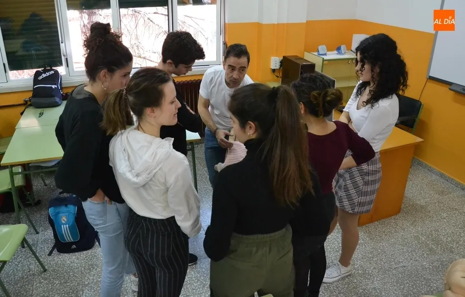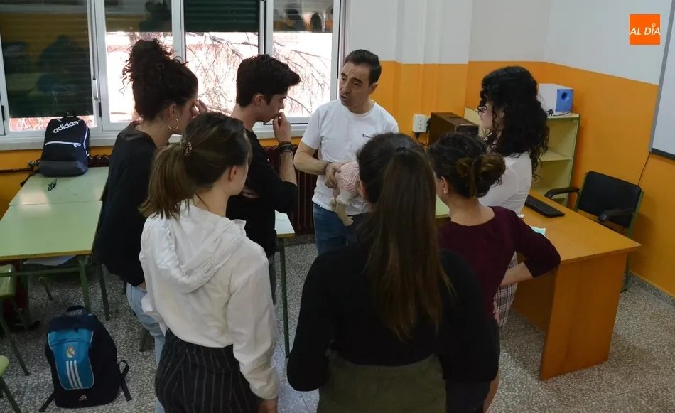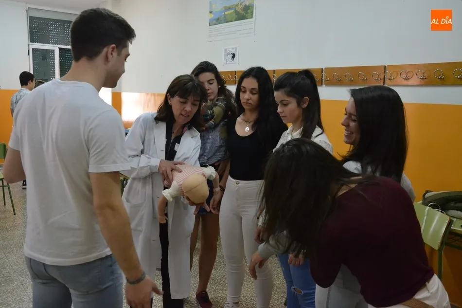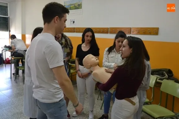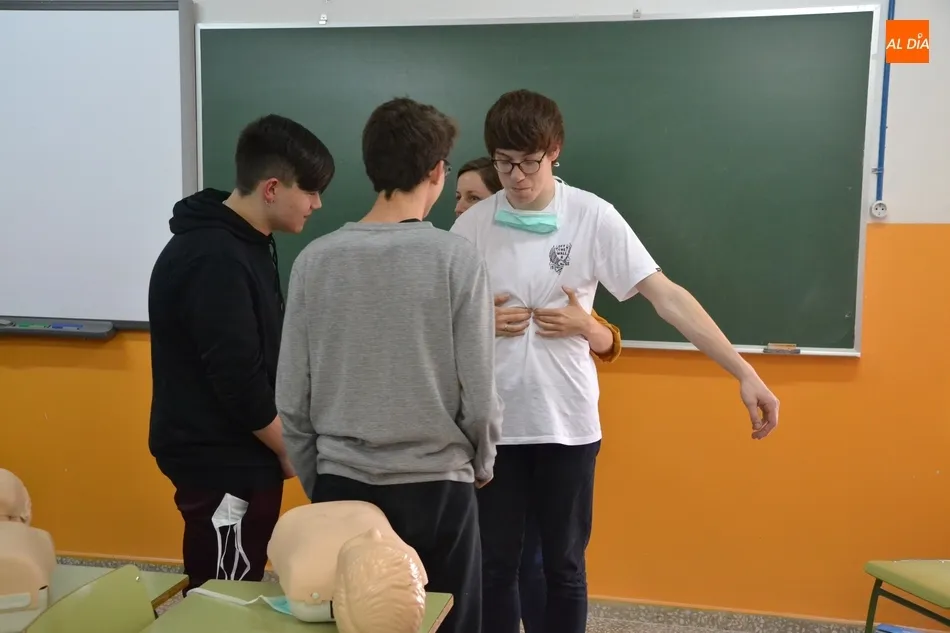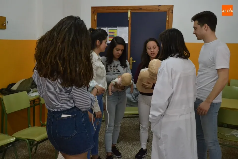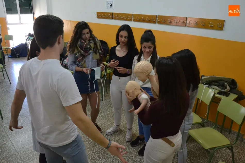 Por tercer año consecutivo, el IES Fray Diego Tadeo de Ciudad Rodrigo recibió en la mañana del viernes la visita de un grupo de profesionales de la Unidad de Pediatría del Hospital Clínico Universitario de Salamanca, que se desplazaron al centro para formar a un nuevo grupo de alumnos en la realización de la reanimación cardiopulmonar.
