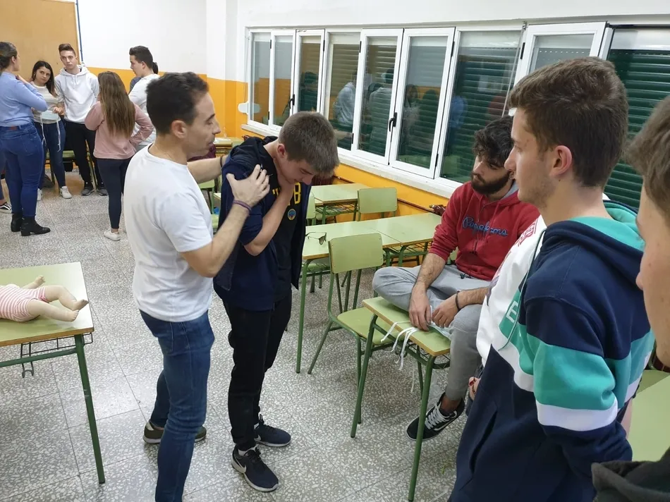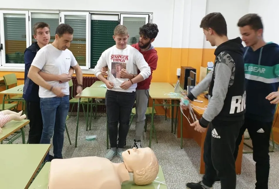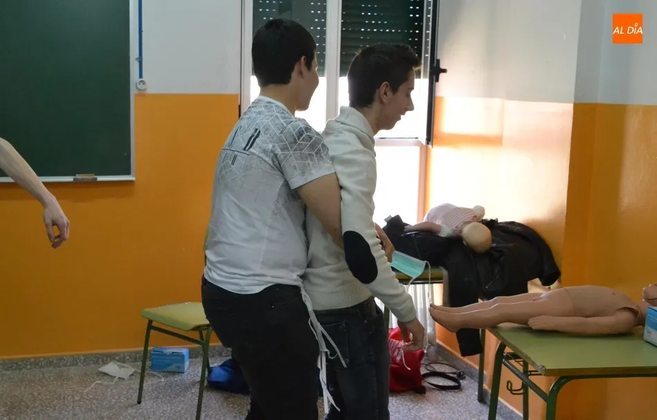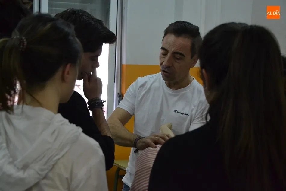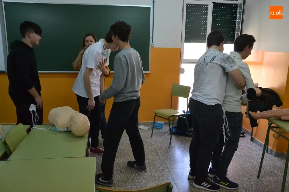 Los destinatarios concretos del taller (promovido por la Asociación de Madres y Padres Julián Sánchez El Charro) fueron, como en años anteriores, los alumnos que están este curso en 4º de la ESO. Repartidos en dos grupos, los alumnos recibieron formación tanto teórica como práctica por parte del equipo dirigido por Pedro Gómez de Quero, instructor y director de reanimación cardiopulmonar.