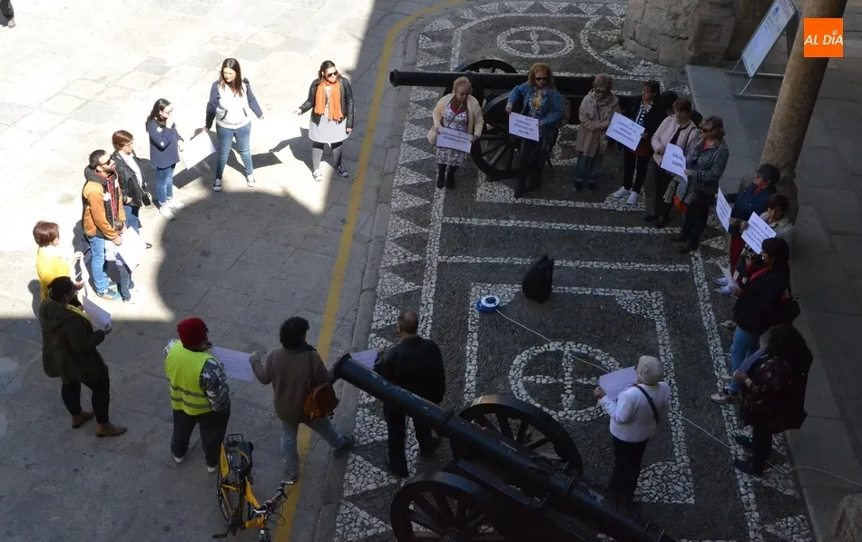 La conmemoración de este año, desarrollada a los pies de la Casa Consistorial ante la mirada curiosa de varios turistas, tuvo dos partes. Para empezar, la veintena de personas congregadas conformaron un círculo, permaneciendo varios minutos en silencio mientras lucían pancartas donde se reivindicaban salarios dignos, la prestación por desempleo, la inclusión en la Ley de Prevención de Riesgos Laborales, y el respeto a los descansos, vacaciones y festivos.