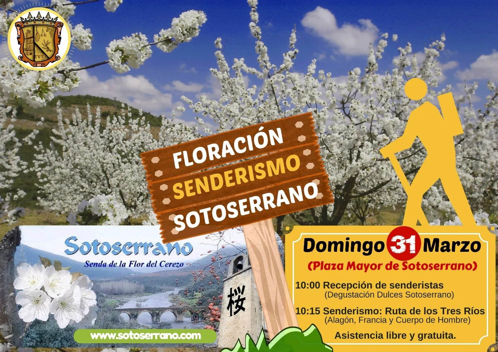 La fiesta se basa principalmente en recorre la conocida ruta senderista de Los Tres Ríos, en la zona de confluencia de los ríos Alagón, Francia y Cuerpo de Hombre. El tramo que se recorre en la fiesta de la floración del cerezo transcurre por una preciosa senda paralela al Río Alagón que a finales de marzo muestra una de sus mejores caras de todo el año, brillando a su máximo esplendor. Un paisaje incomparable con el puente romano y ?la junta? del río Cuerpo de Hombre con el río Alagón. Sotoserrano es uno de los mejores y mayores productores de cerezas de España. Su clima, su temperatura hacen de este el lugar idóneo para la producción de este sabroso y saludable fruto.