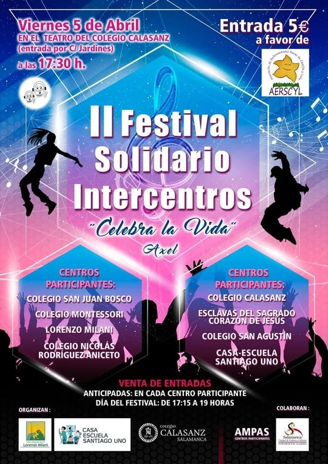 Cerca de 250 escolares participarán en la segunda edición del Festival Solidario Intercentros que tendrá lugar el viernes, 5 de abril, en el teatro del Colegio Calasanz. Organizado por las Presencia Escolapia de Salamanca, este año la recaudación irá destinada a la Asociación de Enfermedades Raras de Castilla y León (Aerscyl).