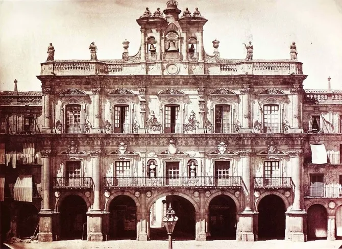 • Casa Consistorial, una de las primeras imágenes fotográficas que se conservan de la Plaza, y llama la atención la ropa tendida en uno de sus balcones. Relizada por Martín Herbert, en 1863.