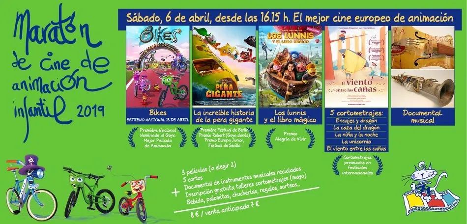 Aprovechando la celebración de este maratón se estrenará en exclusiva la película de animación española ?Bikes? (cuyo estreno nacional está previsto para el día 18 de abril), nominada al Goya a la Mejor Película de Animación. Además se proyectarán ?La increíble historia de la pera gigante?, ?Los Lunis y el libro mágico? y cinco cortometrajes premiados en festivales internacionales: ?Encajes y dragón?, ?La caza del dragón?, ?La niña y la noche?, ?La unicornio? y ?El viento entre las cañas?.