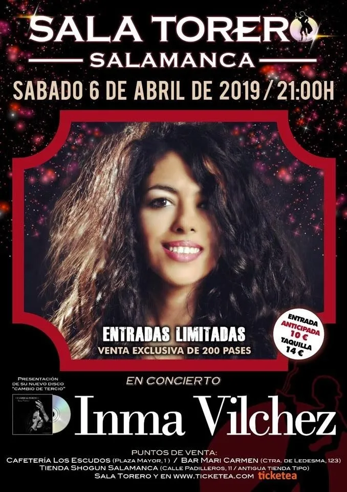 Inma Vilchez regresa este sábado, 6 de abril, a la Sala Torero de Salamanca tras haber conseguido un gran éxito en su pasada visita, colgando el cartel de ?sold out? (todas las entradas vendidas).