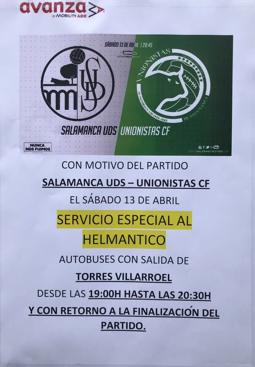 Las salidas hacia el coliseo charro comenzará a producirse desde las 19:00 a las 20:30 horas del próximo sábado 13 de abril desde Torres Villaroel, mientras que los seguidores que presencien el encuentro podrán regresar del mismo modo a Salamanca tras la conclusión del encuentro.