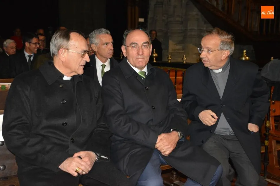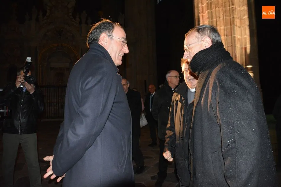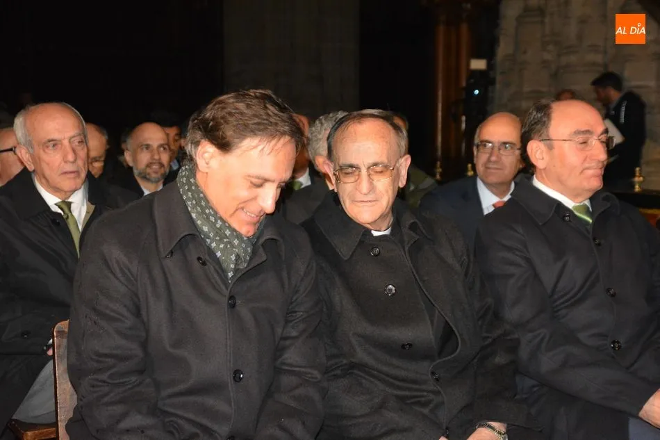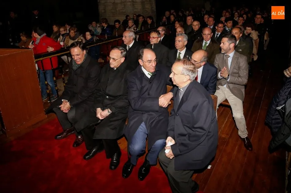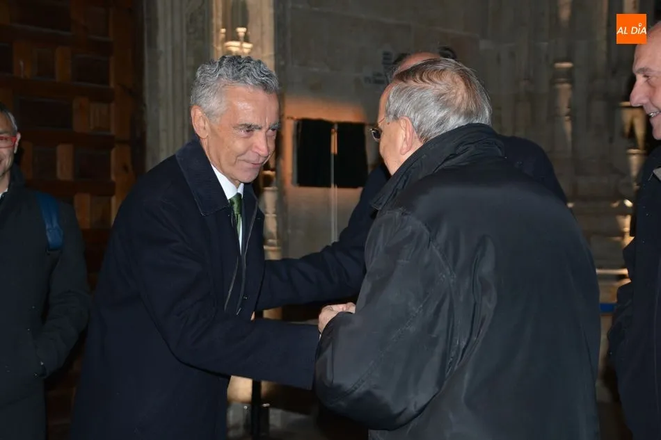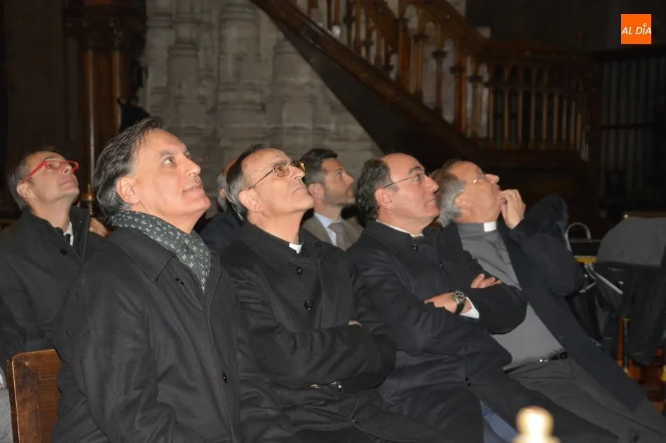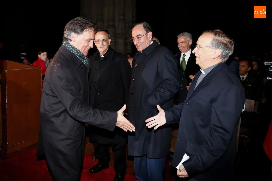 El obispo de Salamanca, Carlos López; el presidente de Iberdrola, Ignacio Galán; el alcalde de Salamanca, Carlos García Carbayo; el deán-presidente del Cabildo Catedral, Florentino Gutiérrez, y el presidente de la Fundación Iberdrola España, Fernando García, han asistido al primer encendido de esta iluminación con la que la Catedral Nueva mejorará su eficiencia energética un 87%.
