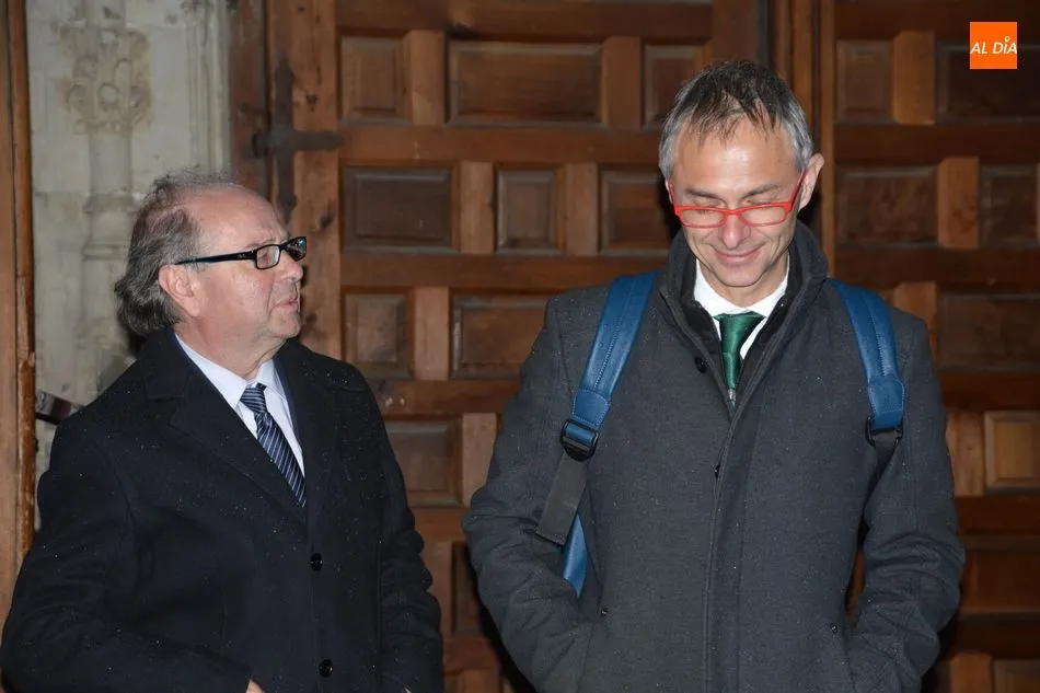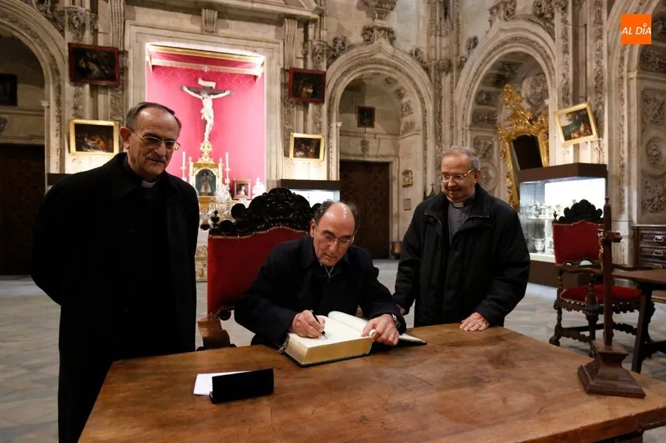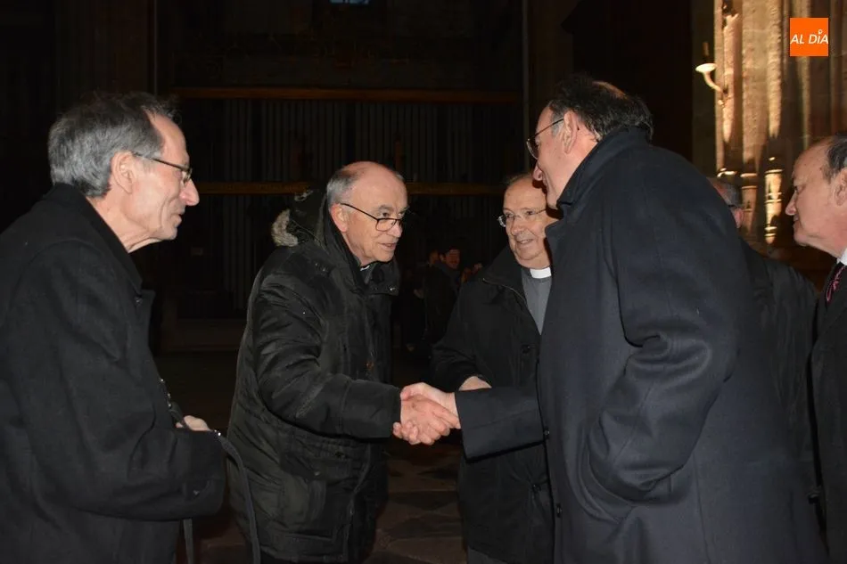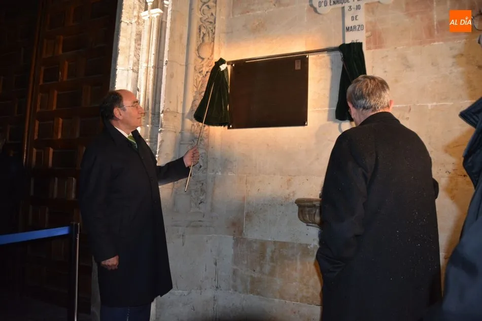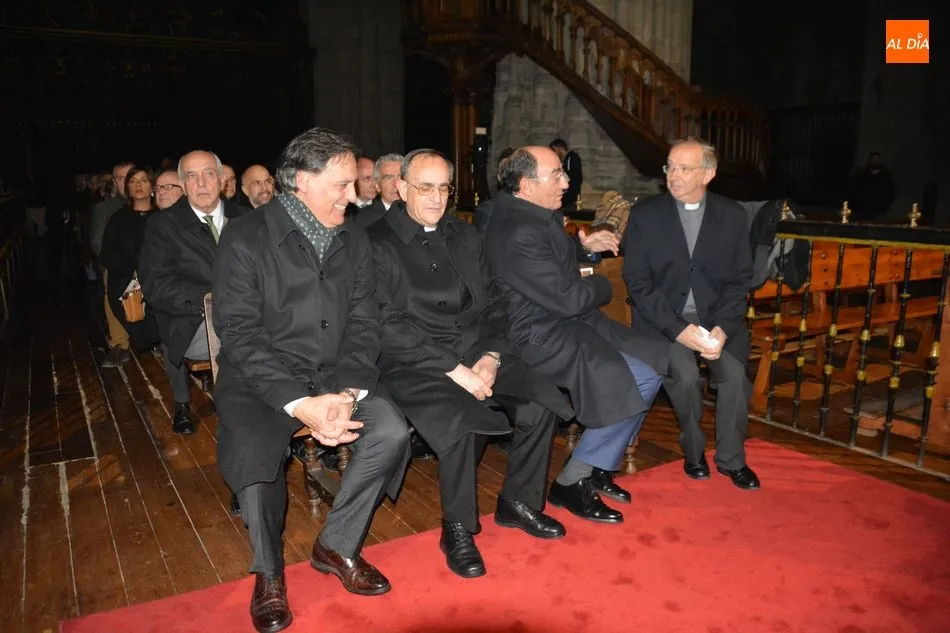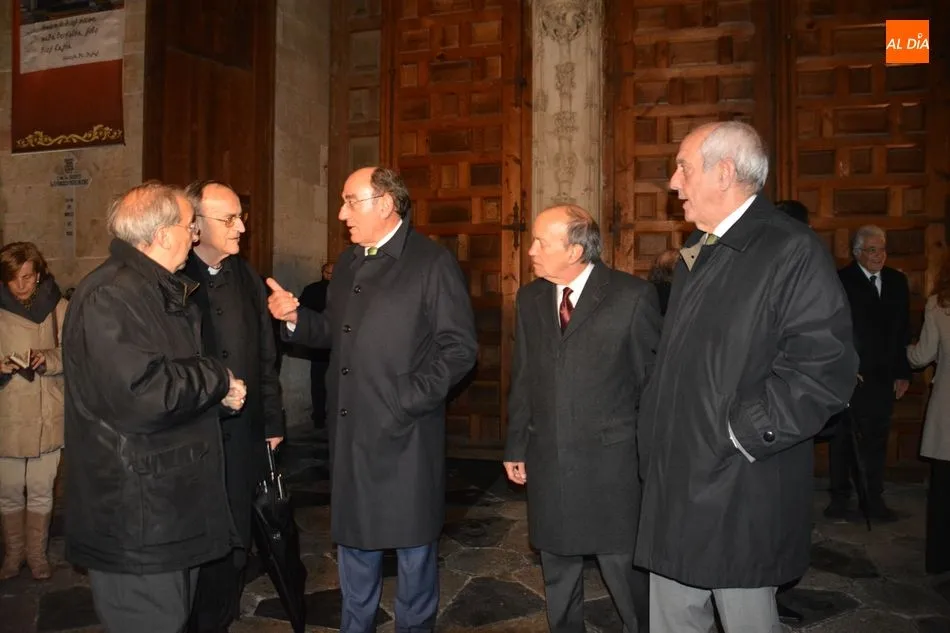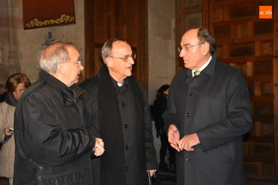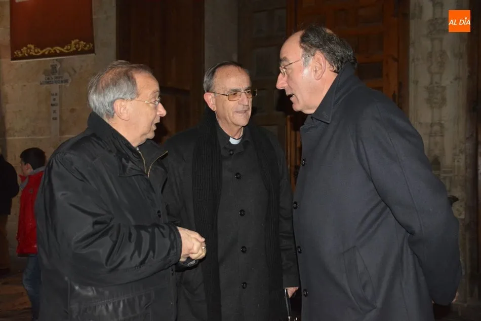 El obispo de Salamanca, Carlos López; el presidente de Iberdrola, Ignacio Galán; el alcalde de Salamanca, Carlos García Carbayo; el deán-presidente del Cabildo Catedral, Florentino Gutiérrez, y el presidente de la Fundación Iberdrola España, Fernando García, han asistido al primer encendido de esta iluminación con la que la Catedral Nueva mejorará su eficiencia energética un 87%.