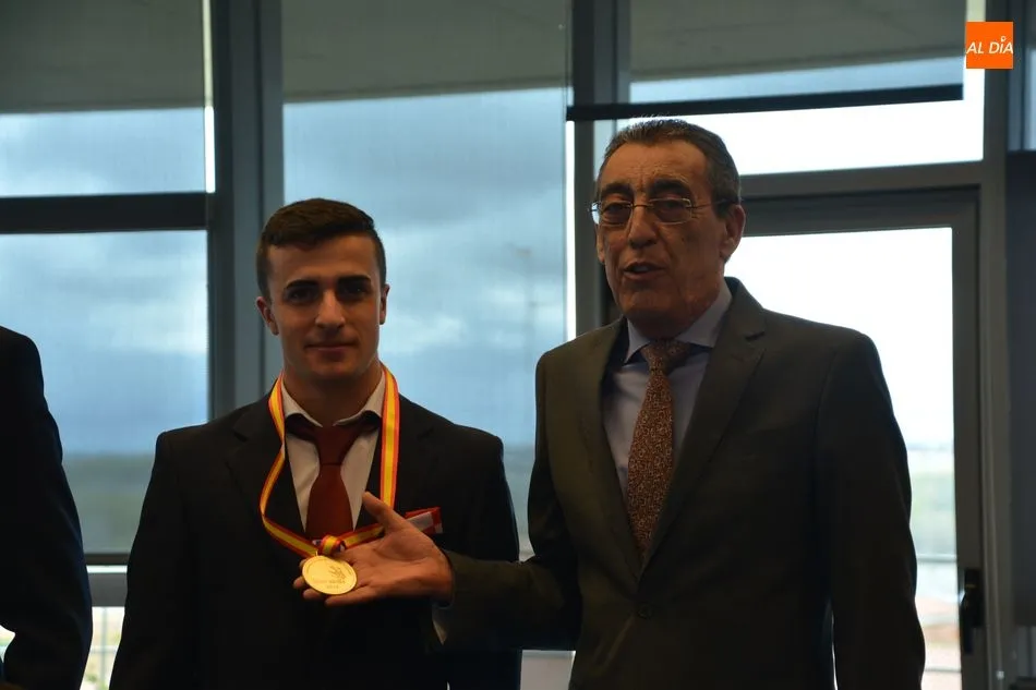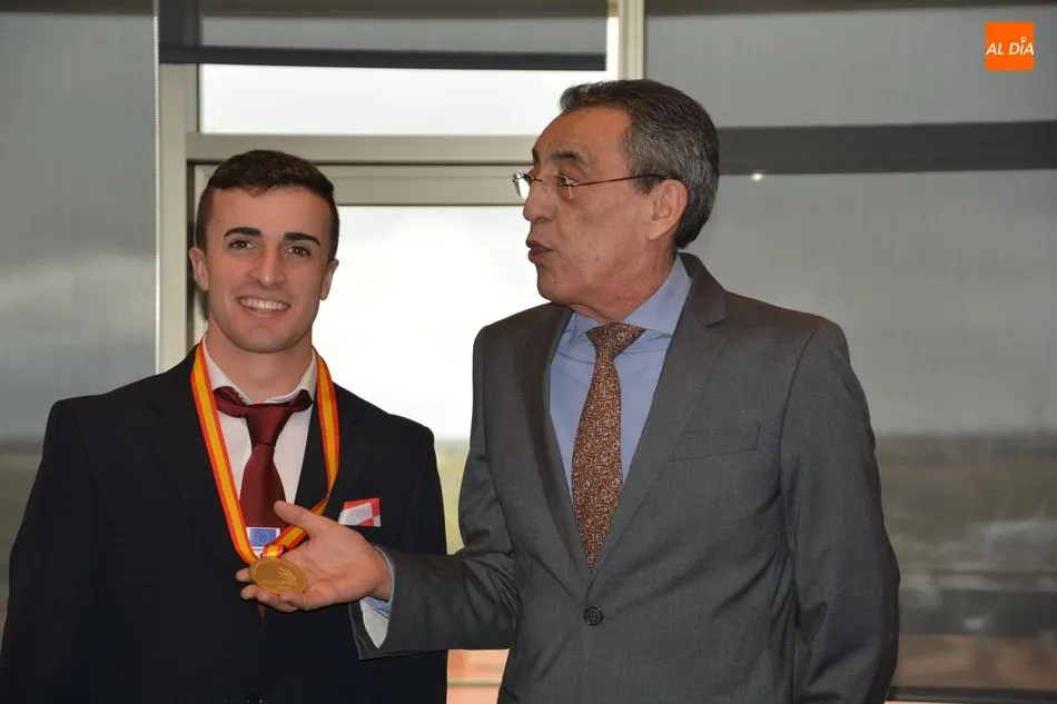 Felipe Martín Gutiérrez, de Tecnología del Automóvil, y Alejandro Sánchez Martín, de Refrigeración y Aire Acondicionado, han recibido la felicitación del delegado territorial, Bienvenido Mena, por sus medallas de oro y de plata respectivamente en los campeonatos Spainskills, que se celebraron la semana pasada en Madrid.
