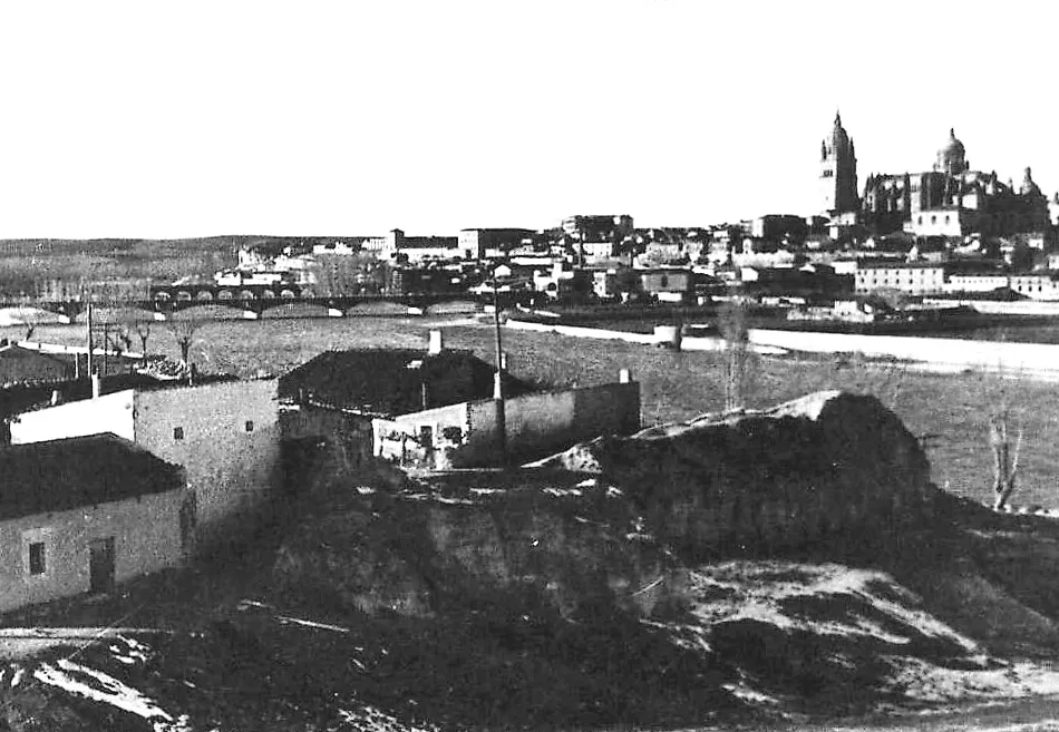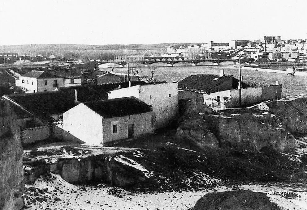 En la foto de la carretera sobresalen el Matadero y su barrio, compuesto por sencillas viviendas de alquiler construidas en las primeras décadas del siglo XX. En otra imagen aparecen las casas que serían derribadas para construir el barrio de la Vega.