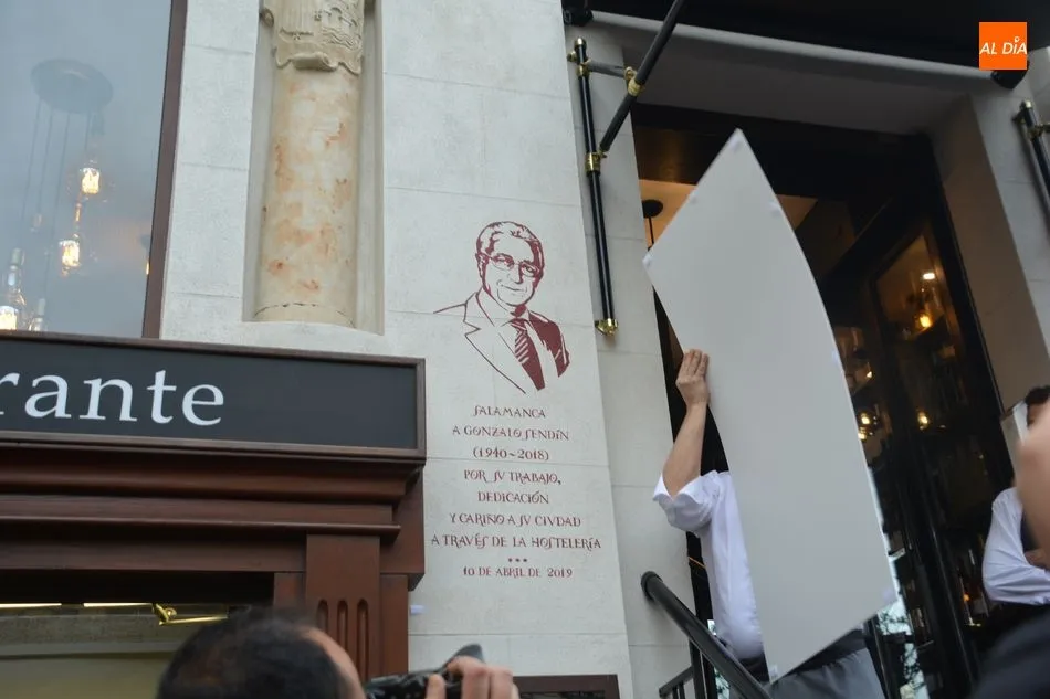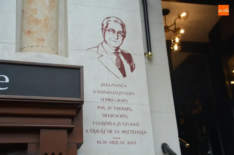 El Ayuntamiento de Salamanca y la Asociación de Empresarios de Hostelería de Salamanca han realizado, este miércoles, un reconocimiento público al hostelero Gonzalo Sendín Hernández (1948-2018) en forma de vítor en la fachada de su restaurante junto con una inscripción.