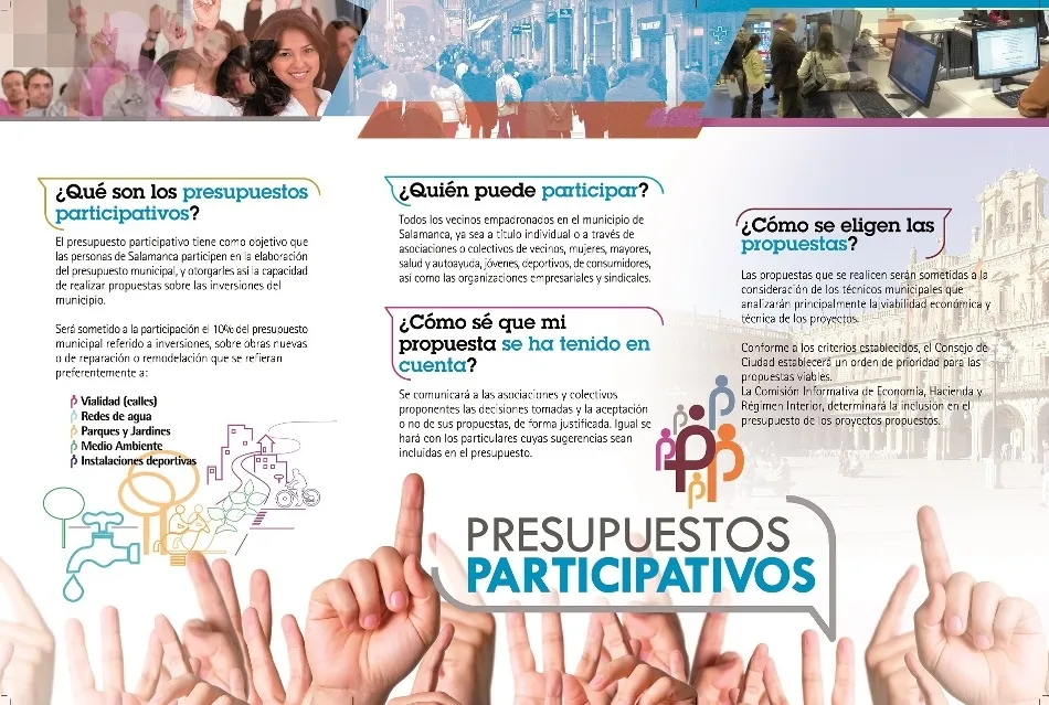 Se someterá a la participación social el 10% del presupuesto municipal referido a inversiones que más afectan en la vida diaria de las personas. De este modo, los salmantinos podrán participar en la elaboración de las partidas destinadas a obras nuevas, de reparación o remodelación de calles, mejoras en parques y jardines de la ciudad, actuaciones en la red de agua, temas de medio ambiente o en instalaciones deportivas municipales.