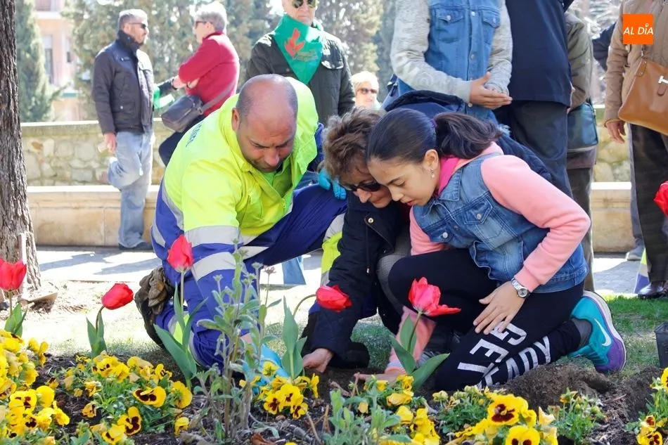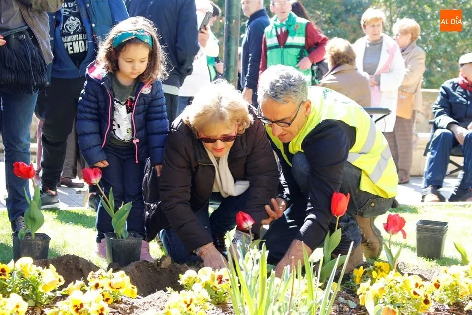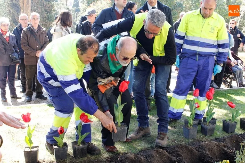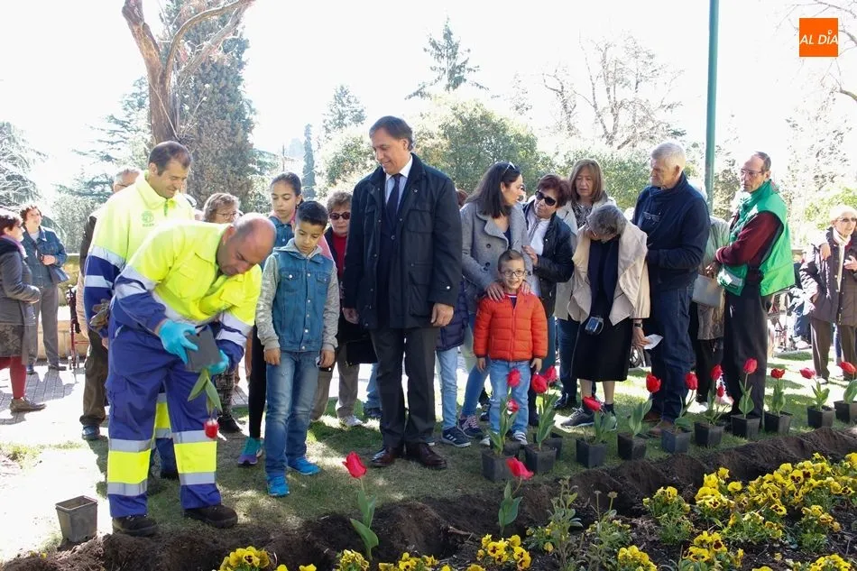 El alcalde de la ciudad, Carlos García Carbayo, ha participado en la mañana de este viernes en la plantación de tulipanes, promovida por la asociación Parkinson Salamanca, junto al Campo de San Francisco. Un acto simbólico con el que esta entidad, que ha estado representada por su presidenta, Teresa Martín, miembros de la Junta Directiva, afectados, usuarios y familias, pretende visibilizar la enfermedad.