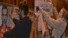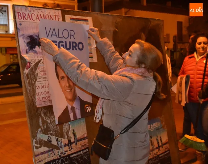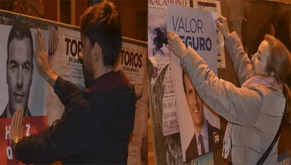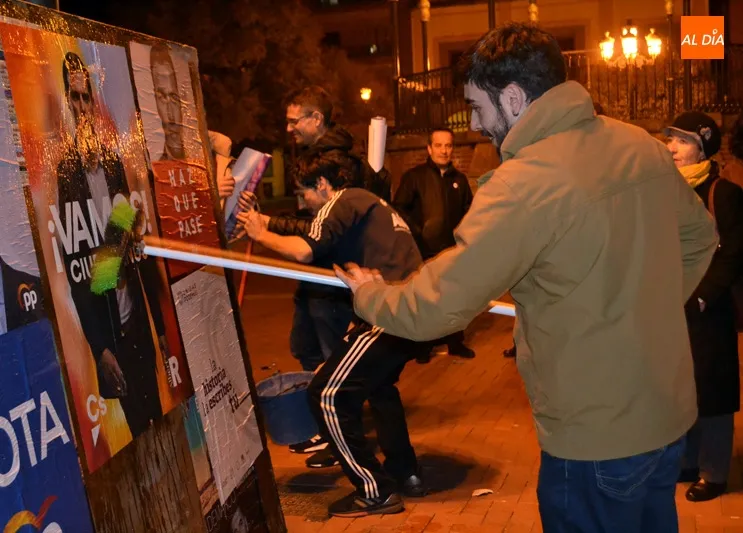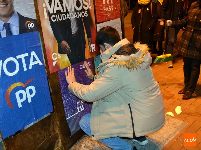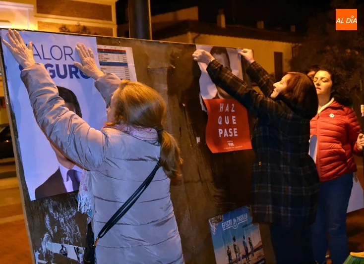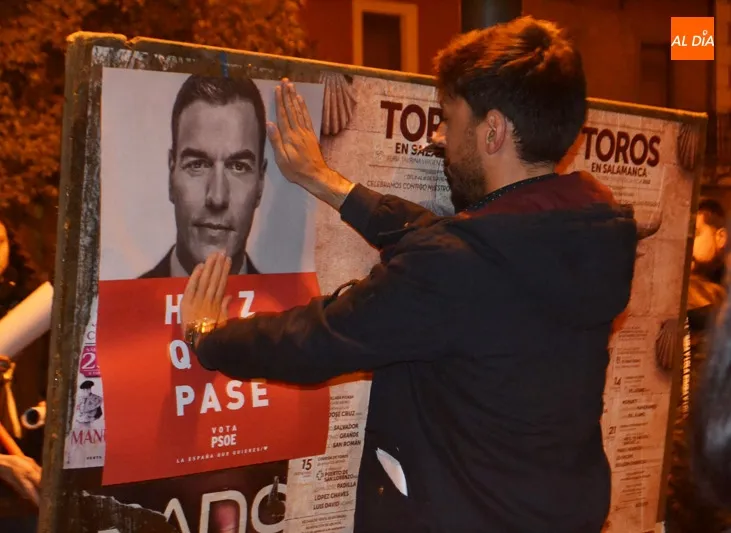 Puntuales, a las doce de la noche, los principales partidos políticos de la ciudad comenzaban la pegada de carteles en el primero de los paneles situado en la Plaza de España. Francisco Díaz, número 2 al Senado por el PSOE salmantino, y Carmen Familiar, 4 en la candidat