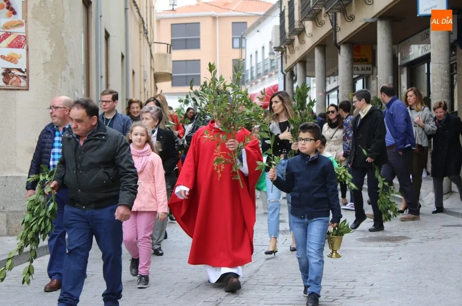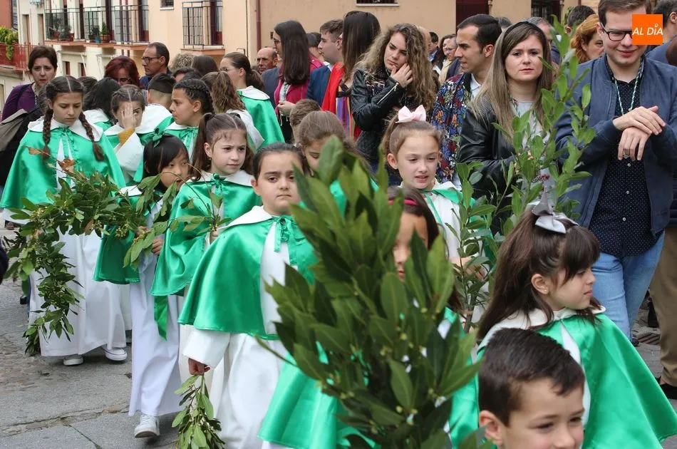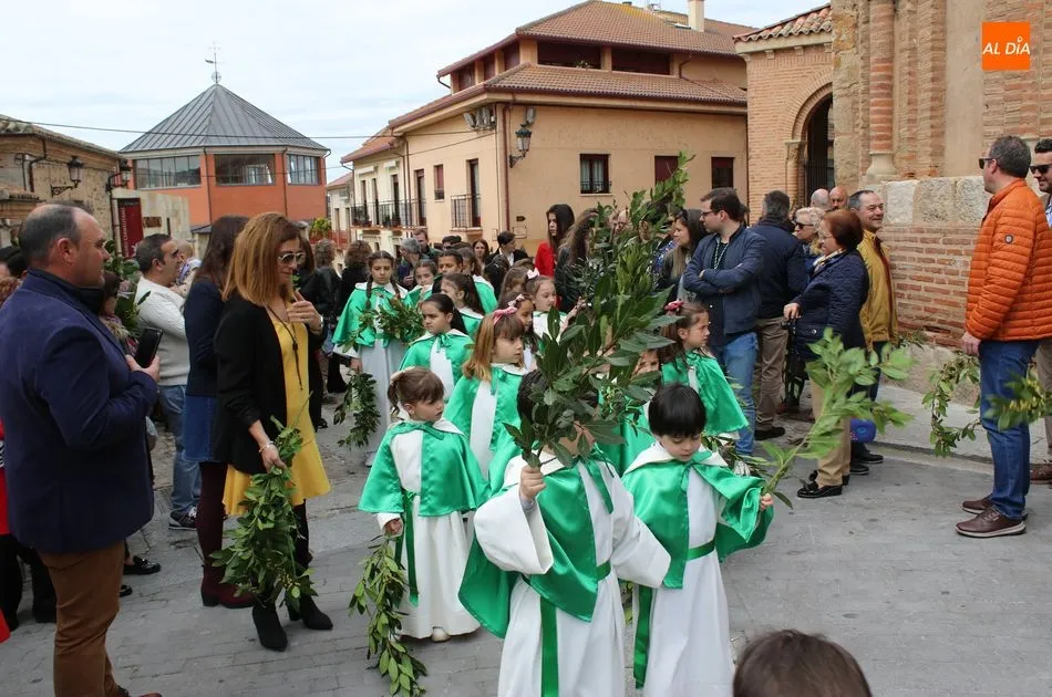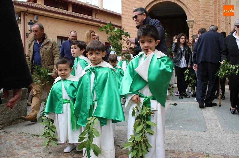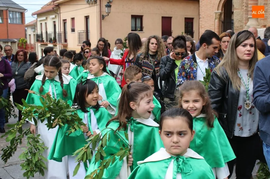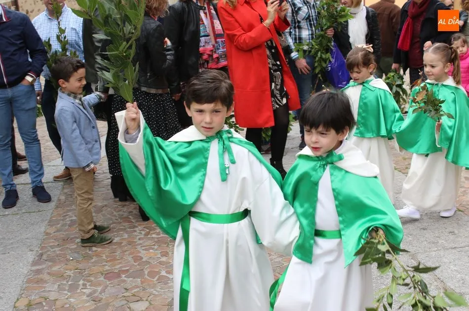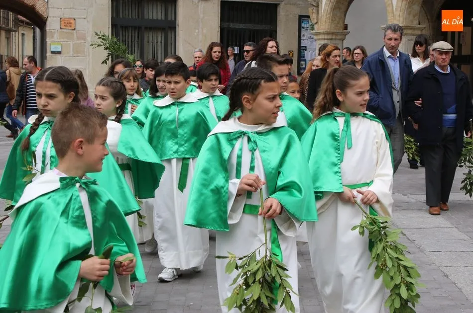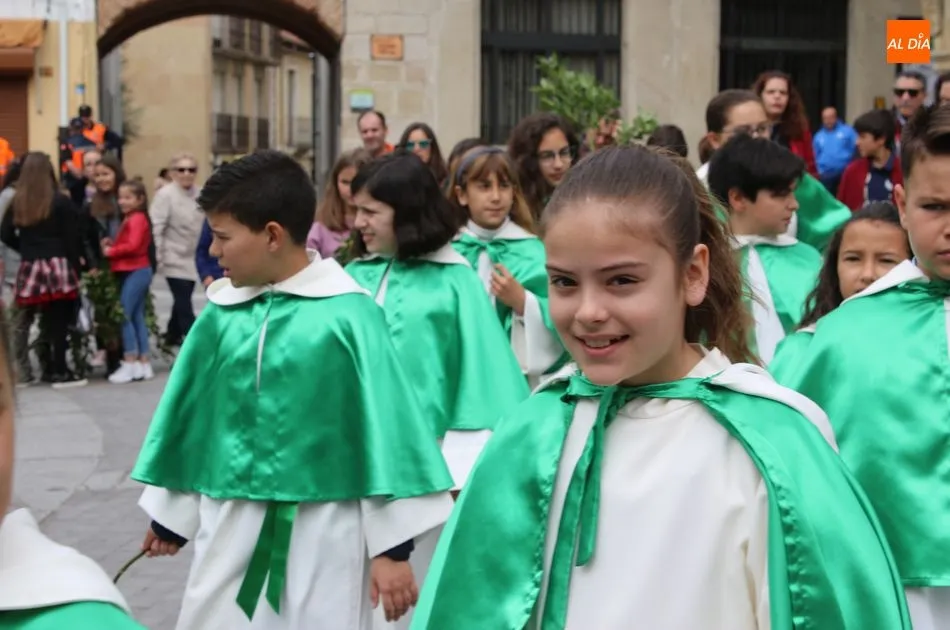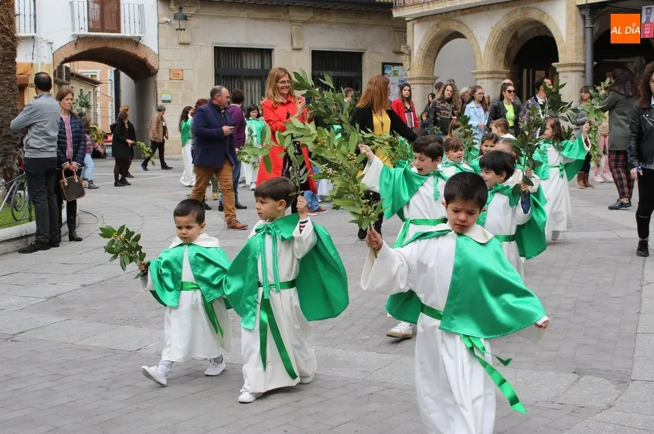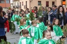 Los niños fueron los principales protagonistas del Domingo de Ramos que arrancó en la iglesia de San Juan, donde tuvo lugar el tradicional reparto de ramos con posterior bendición. Allí precisamente comenzó la procesión que llevó a los más pequeños hasta la iglesia de San Pedro. Ataviados con vestidura blanca y capa verde estuvieron en todo momento acompañados por sus familiares y también por los jóvenes componentes de la cofradía de la Cruz y del Amor.