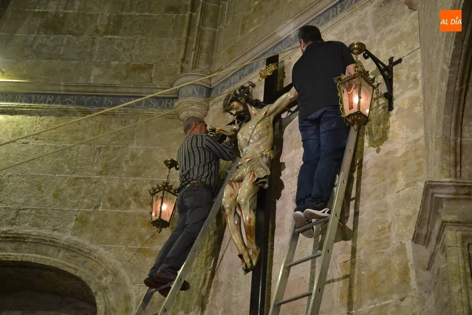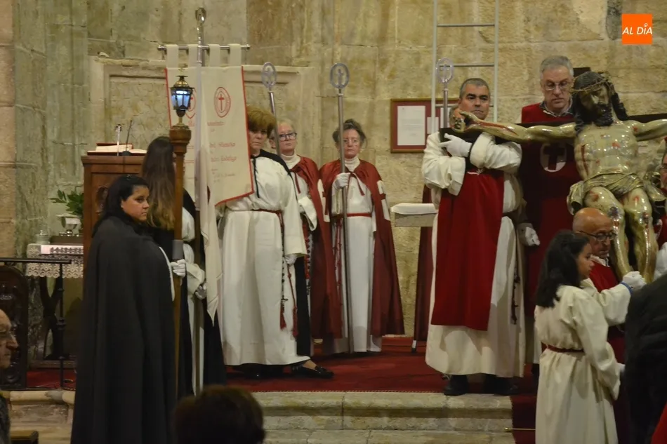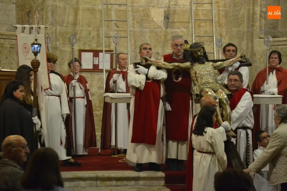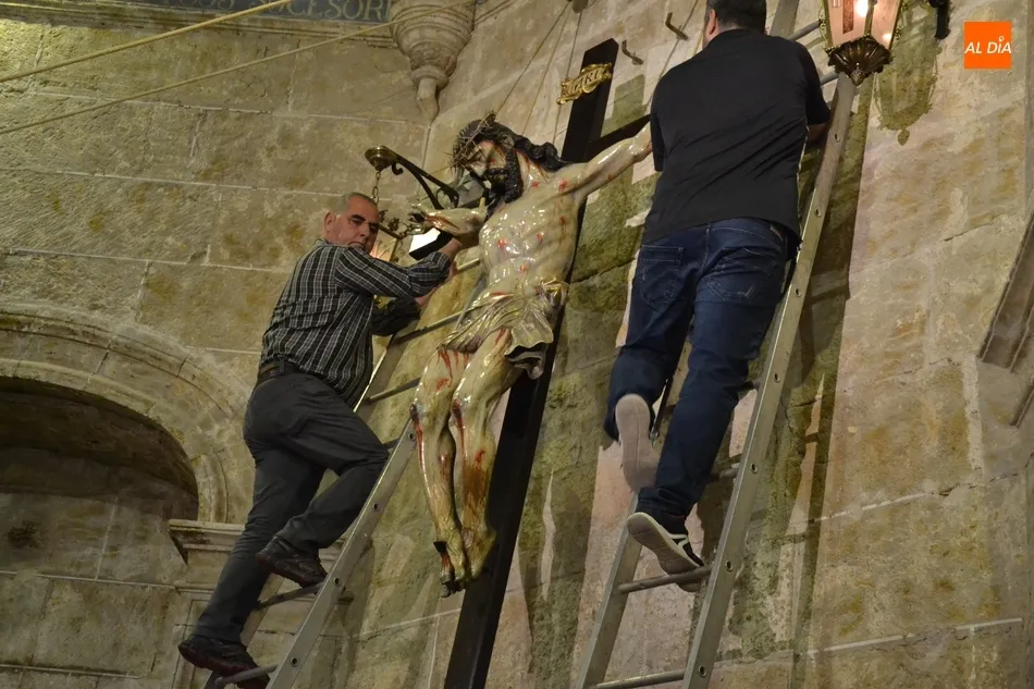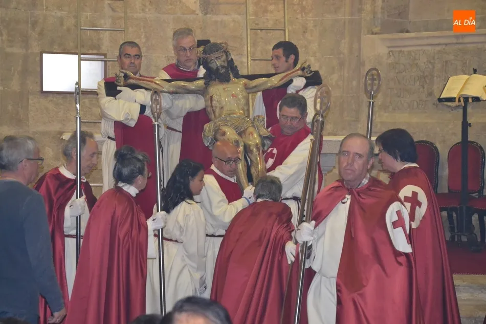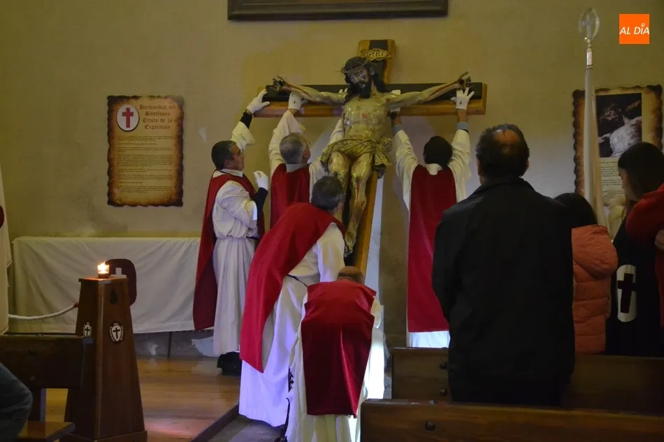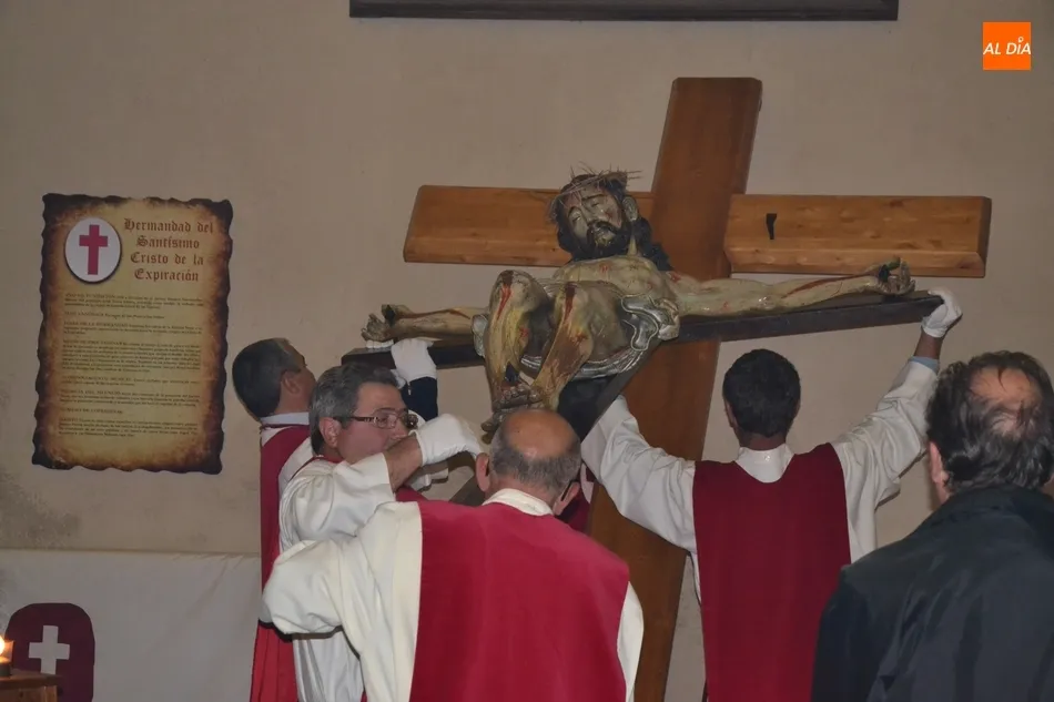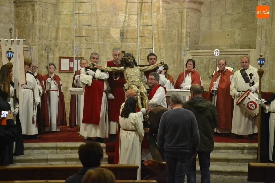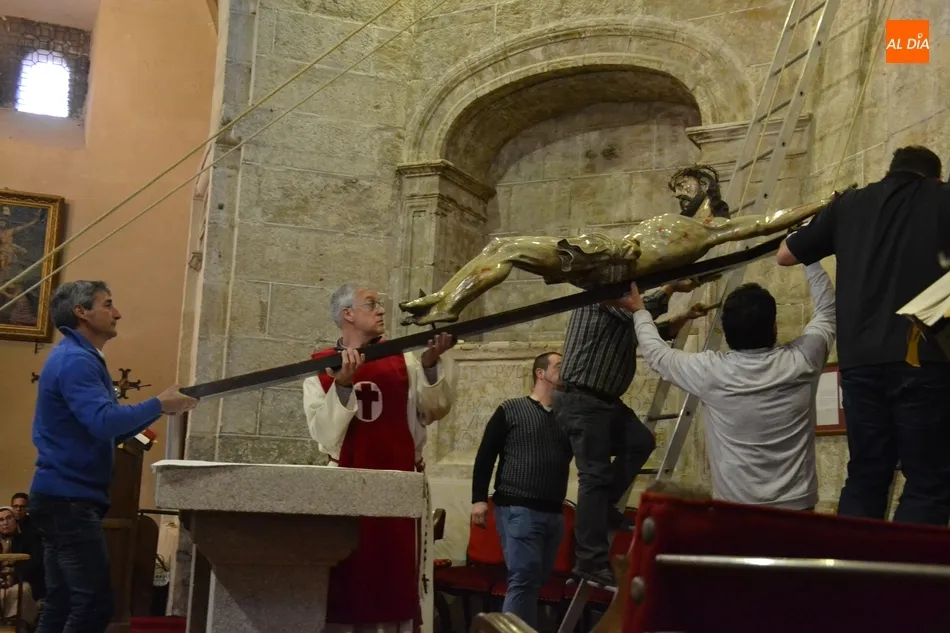 Finalizada la misa, y tras una reflexión final por parte de Ángel Martín Carballo, entraron en escena los primeros miembros de la Hermandad, que procedieron a descolgar la imagen del Cristo y a depositarla sobre la mesa del altar. A continuación, aparecieron otros miembros de la Hermandad, ya con la indumentaria de la entidad, entre ellos los 6 Hermanos Mayores de este año: Carmina García Ortega, Manuel Zamarreño Matilla, Paquita García Ortega, Leonor González, Pilar Adriana Vicente y Gabriel de Aller.