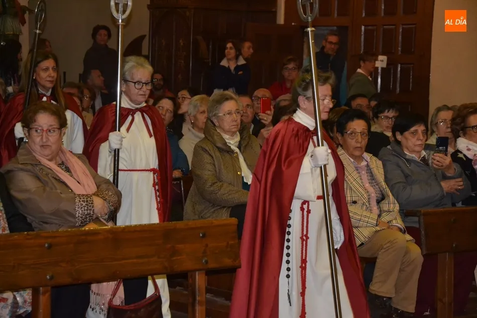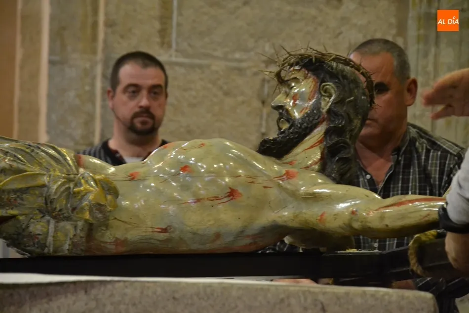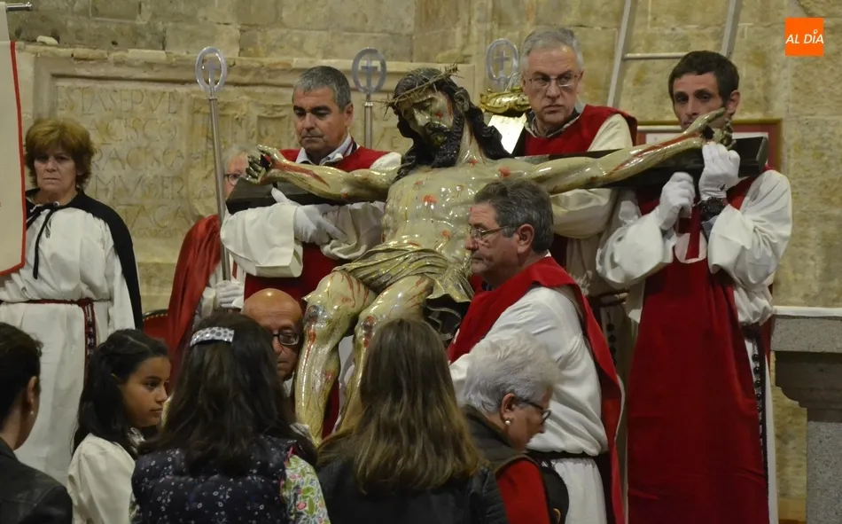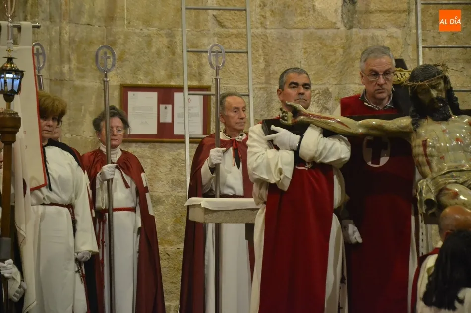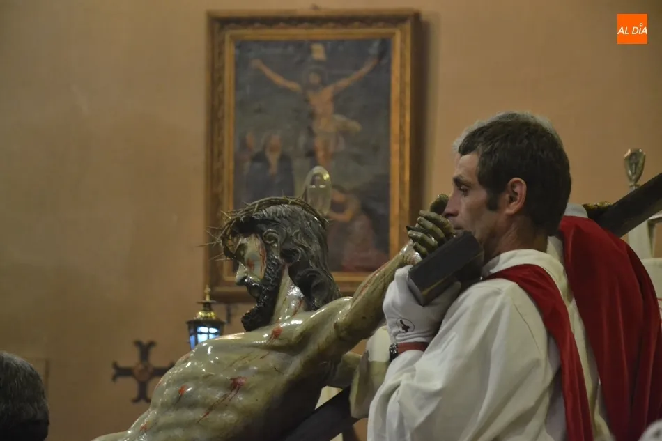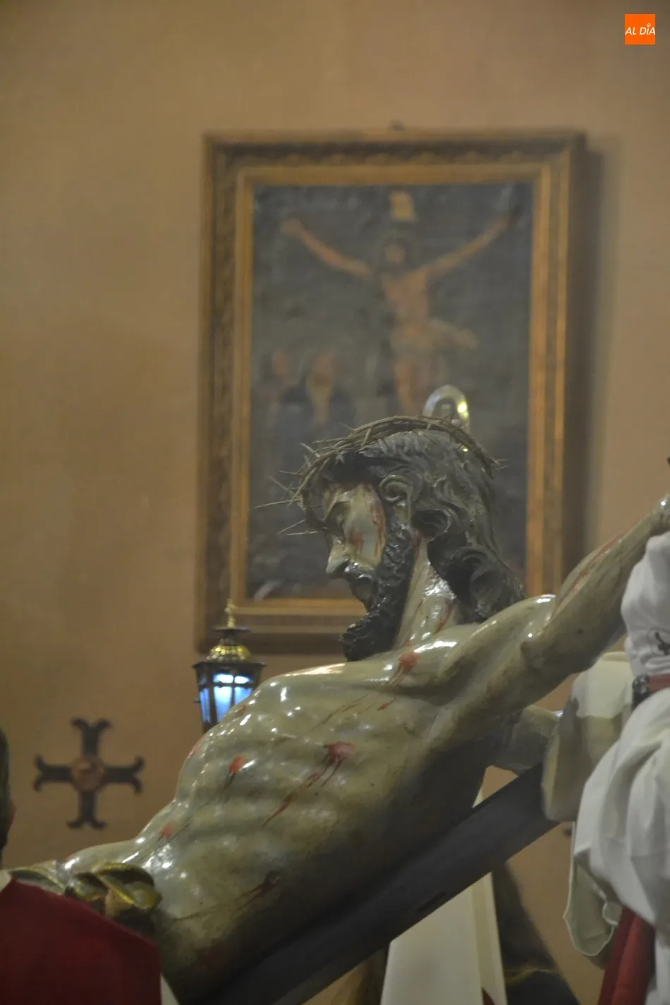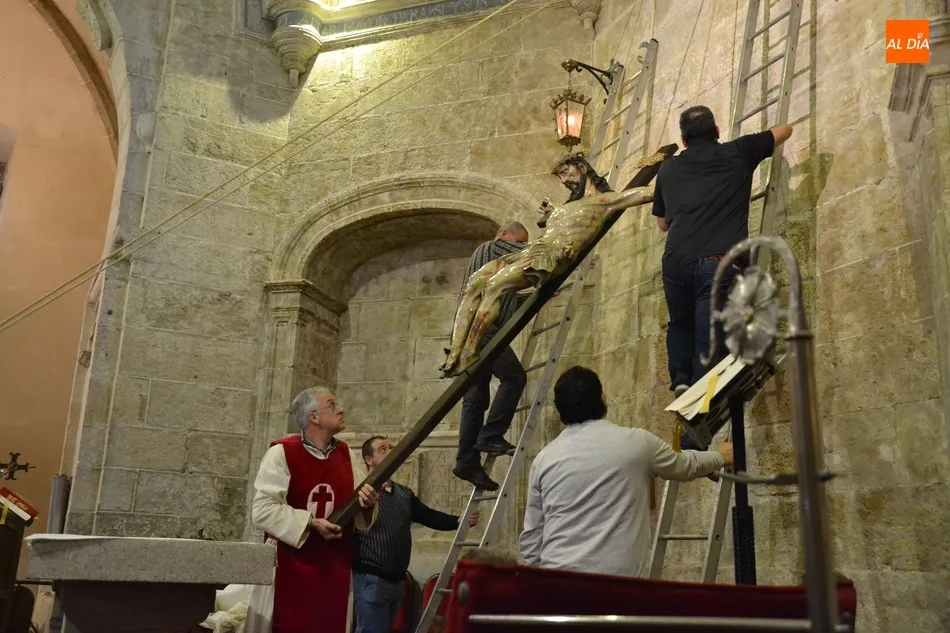 Finalizada la misa, y tras una reflexión final por parte de Ángel Martín Carballo, entraron en escena los primeros miembros de la Hermandad, que procedieron a descolgar la imagen del Cristo y a depositarla sobre la mesa del altar. A continuación, aparecieron otros miembros de la Hermandad, ya con la indumentaria de la entidad, entre ellos los 6 Hermanos Mayores de este año: Carmina García Ortega, Manuel Zamarreño Matilla, Paquita García Ortega, Leonor González, Pilar Adriana Vicente y Gabriel de Aller.