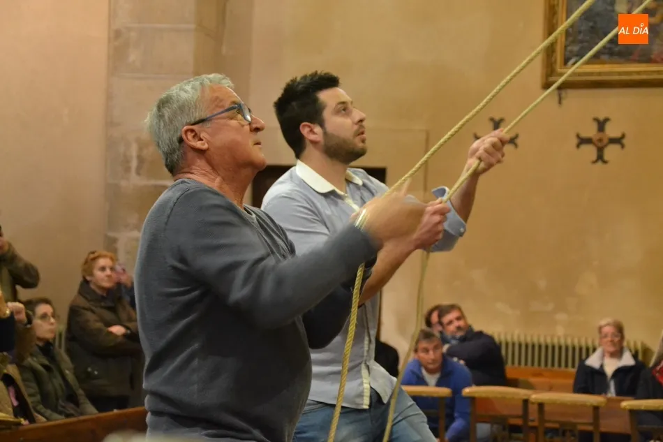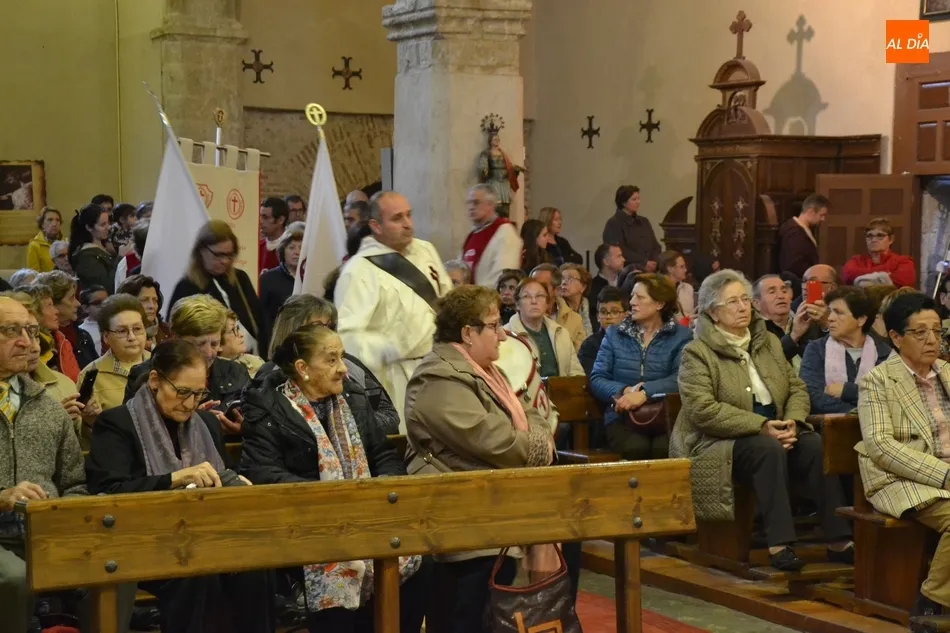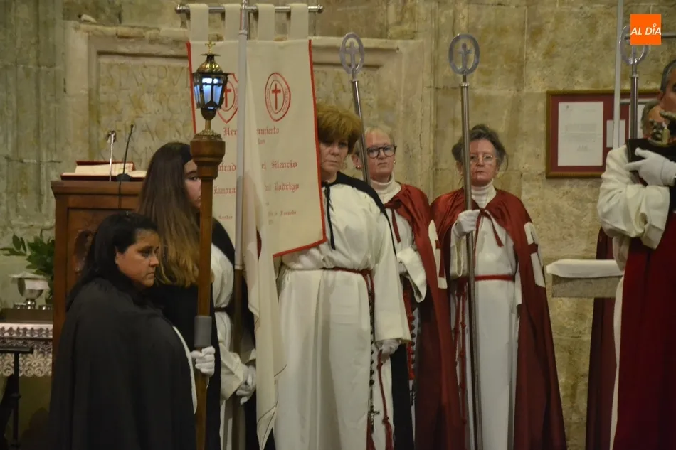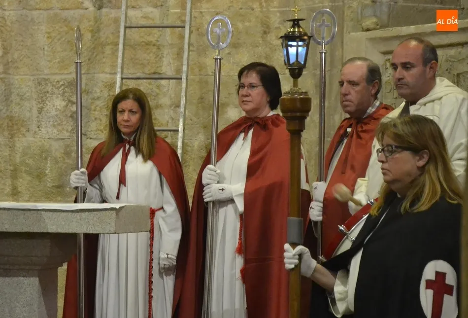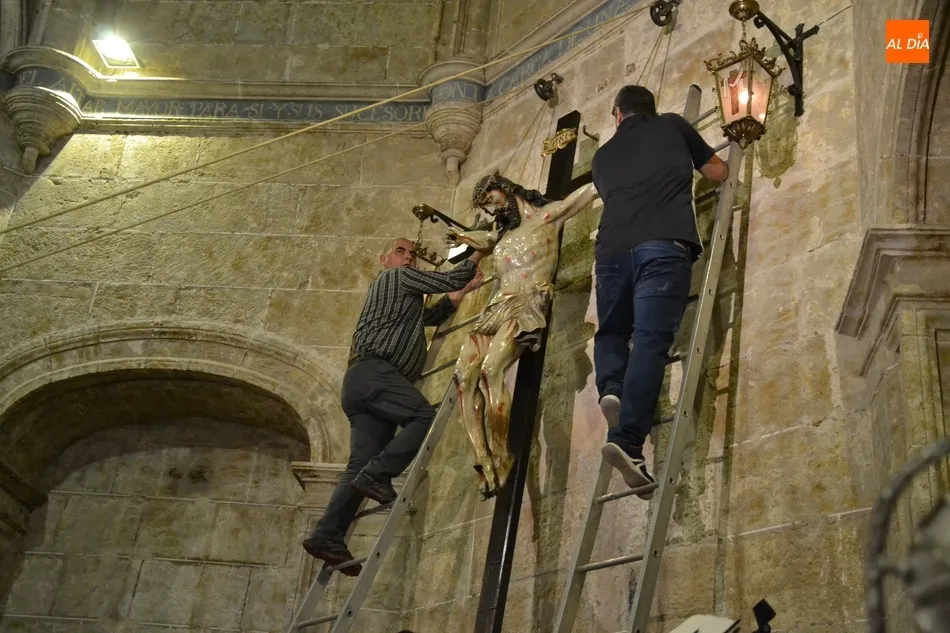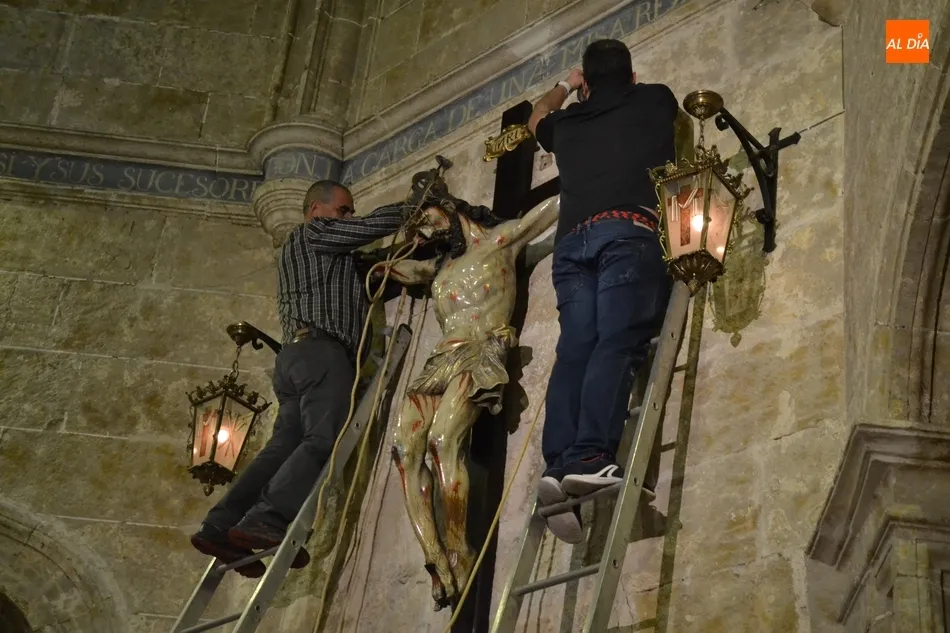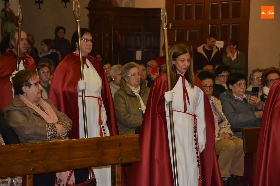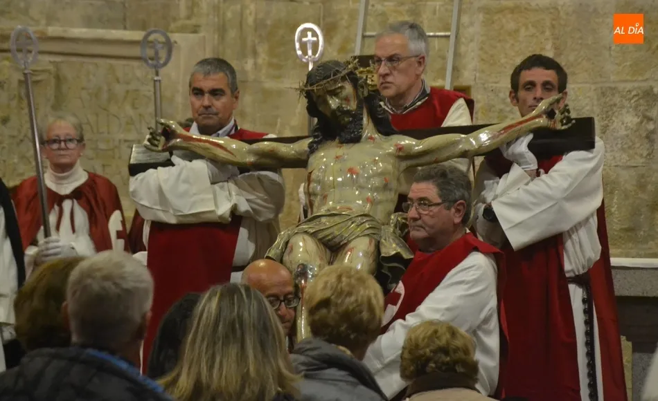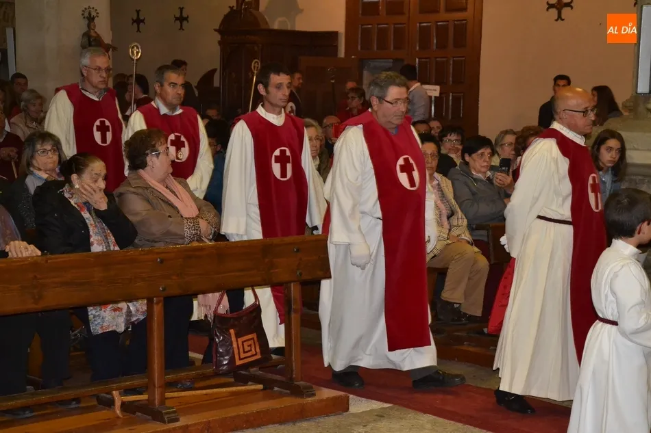 Finalizada la misa, y tras una reflexión final por parte de Ángel Martín Carballo, entraron en escena los primeros miembros de la Hermandad, que procedieron a descolgar la imagen del Cristo y a depositarla sobre la mesa del altar. A continuación, aparecieron otros miembros de la Hermandad, ya con la indumentaria de la entidad, entre ellos los 6 Hermanos Mayores de este año: Carmina García Ortega, Manuel Zamarreño Matilla, Paquita García Ortega, Leonor González, Pilar Adriana Vicente y Gabriel de Aller.