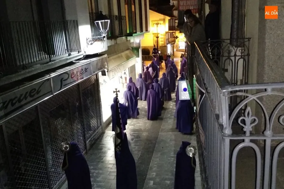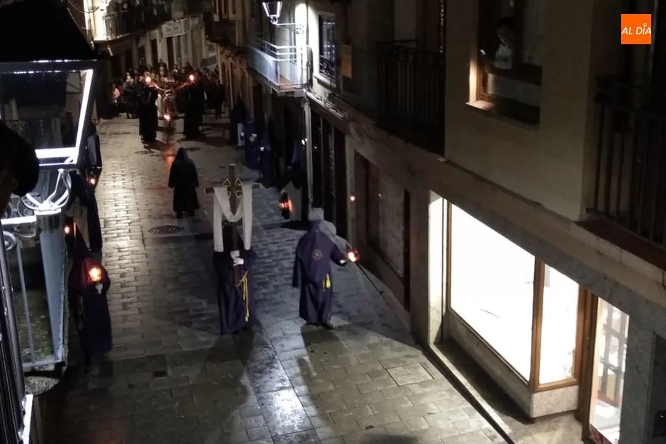 Sobre el suelo mojado de las calles de Béjar ha procesionado esta noche el Vía Crucis de la Cofradía de la Santa Vera Cruz. Hábitos morados en el Lunes Santo han salido de la iglesia de San Juan Bautista caminando en silencio hasta cada estación de penitencia.