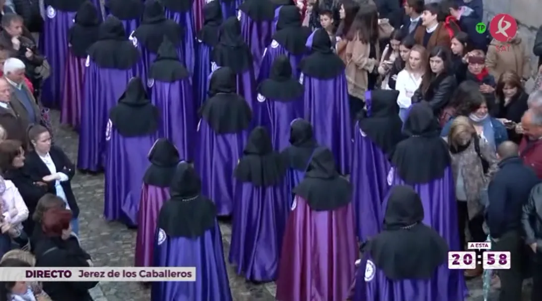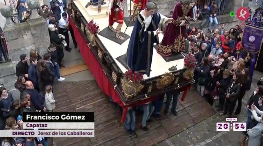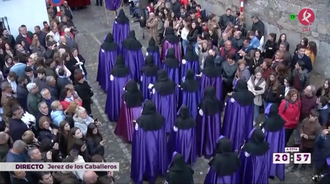 De este modo, la Banda mirobrigense pudo actuar poco más de media hora en las calles de Jerez de los Caballeros, pero al menos hablaron de la misma en la retransmisión televisiva. Concretamente, a la hora de salir la procesión, el narrador principal dio a entender que habían aparecido previamente en el programa (no disponemos de capturas de ese momento): ?los escuchábamos al principio con una marcha un poquito alegre, que nos animaban la tarde, pero ahora ya están metidos en faena, con una marcha adaptada a este paso de misterio?.