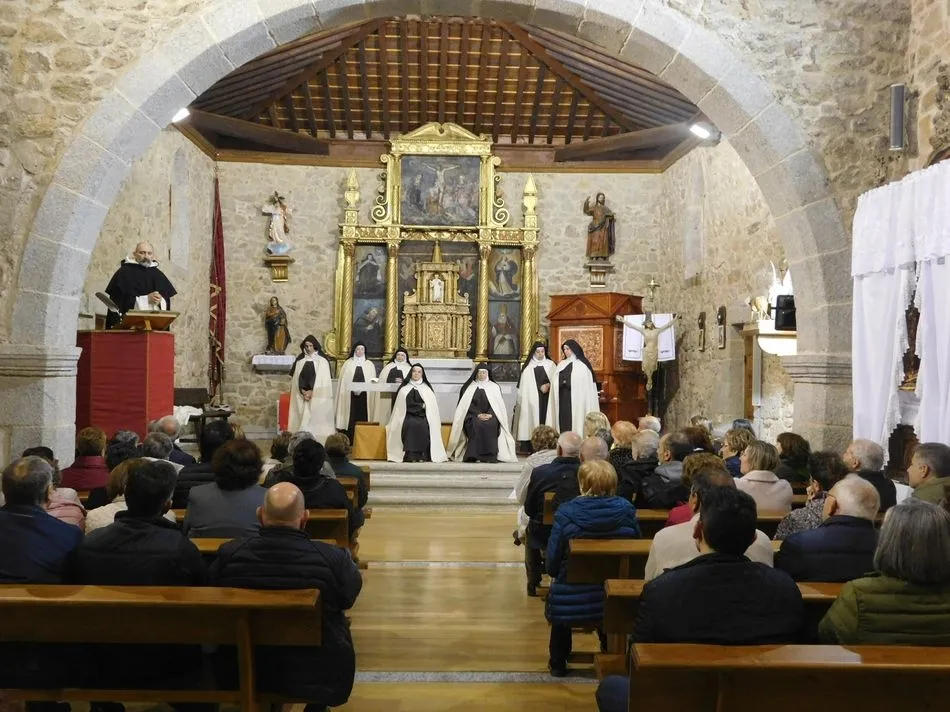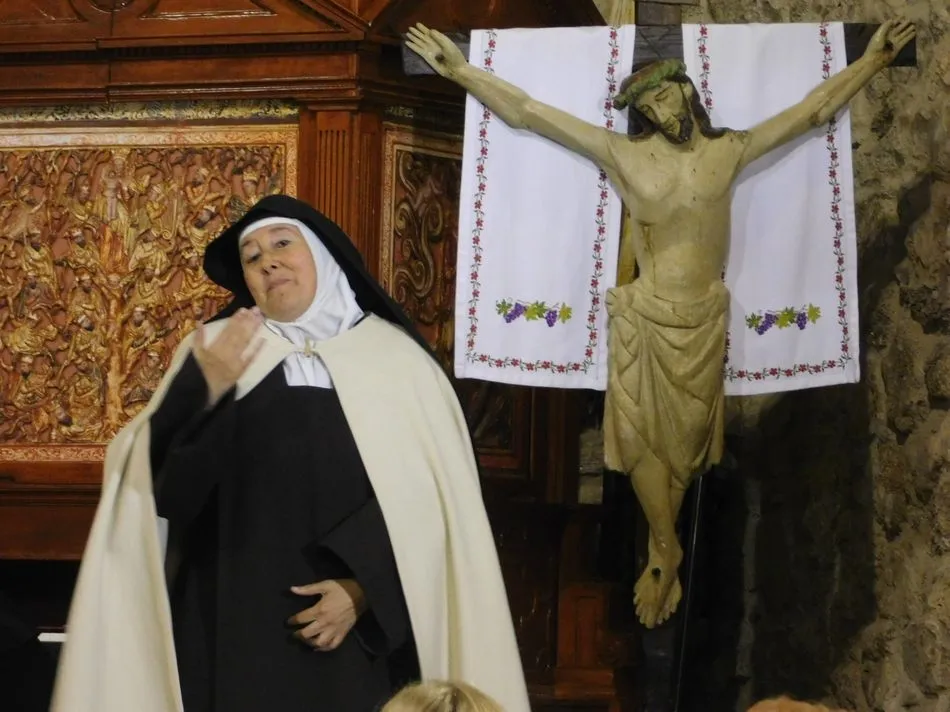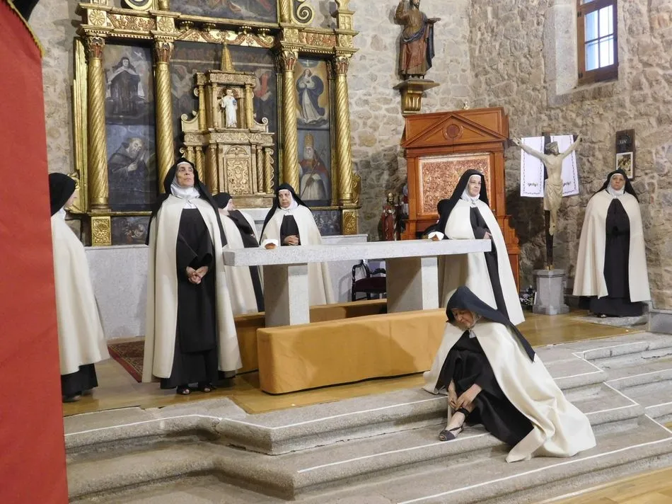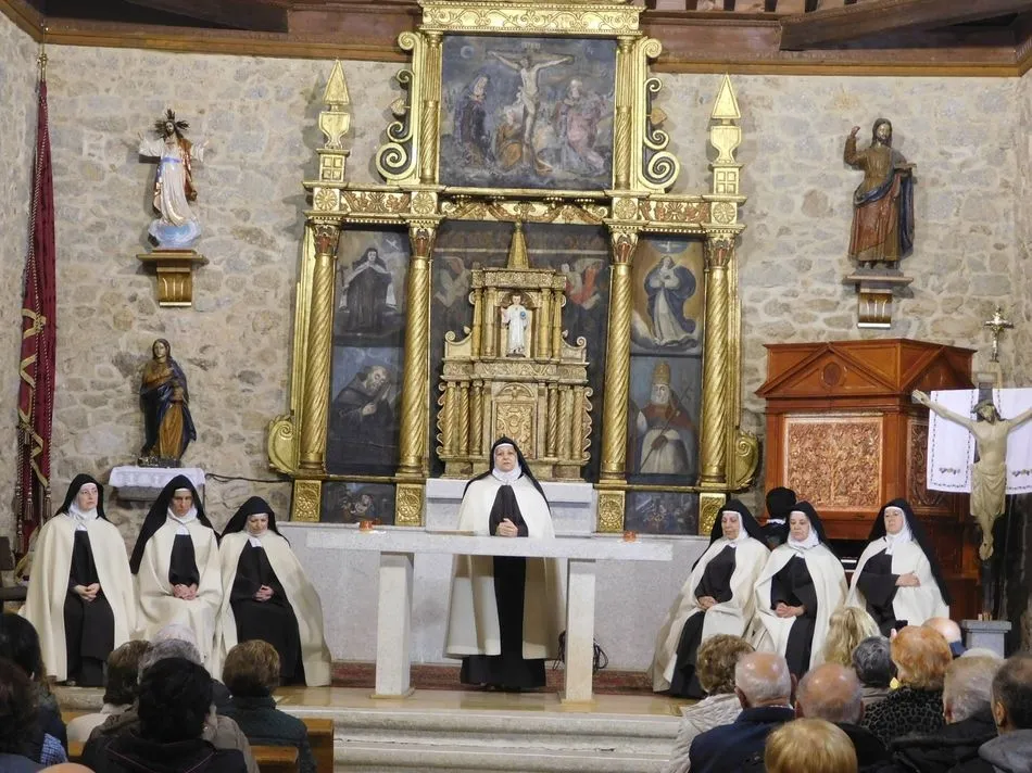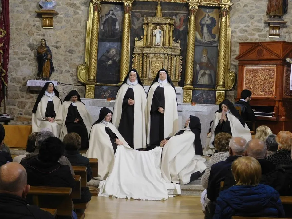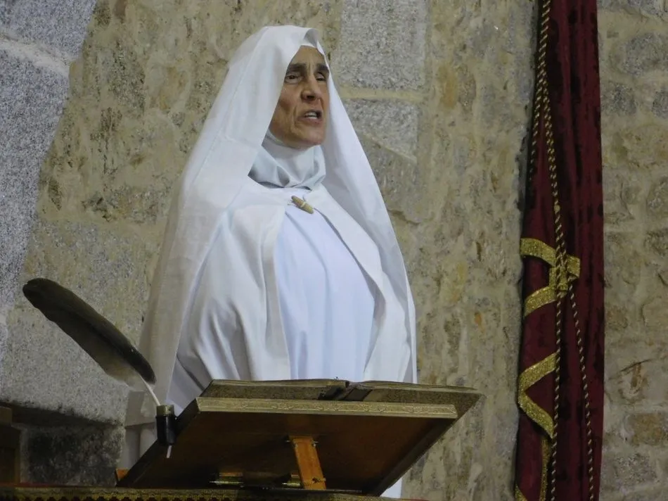 Los muros de la parroquia de esta localidad serrana parecen sentir las familiares vibraciones de la época a la que la obra de teatro traslada a los presentes, pues es el siglo XVI, suena un órgano al que el maestro Salinas interpreta música del Renacimiento, y unas monjas en el portalillo de entrada le dan pie para tocar un Kyrie que ellas cantan según avanzan por la nave. Sus hábitos de paño de oveja no dejan duda alguna de su origen y pertenencia, y un padre dominico en el púlpito desde el que la Inquisición domina la situación empieza un interrogatorio acerca de su amada madre Teresa de Jesús. A partir de ahora la vida se desgrana a borbotones como la sangre de un Cristo que enamoró aquella mujer que como Él quiso cambiar el mundo en clave de Amor. Y lo consiguió porque su ?andariega huella? sigue caminando entre nosotros desde que ?Lazarillo de Tormes? con su peculiar enfoque la haya bajado de los altares para acercarla a la tierra que nunca abandonó hasta su muerte.