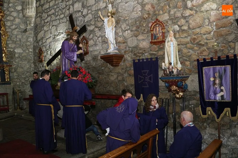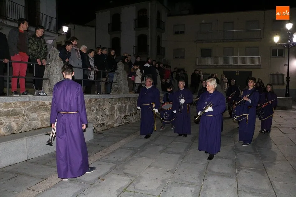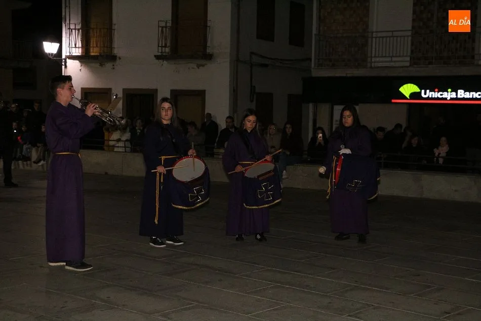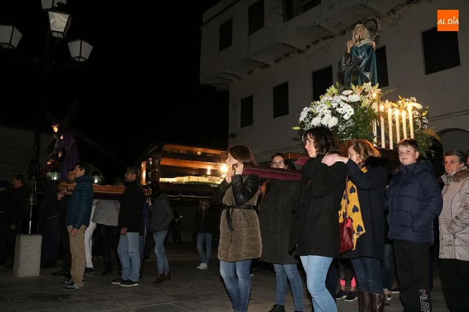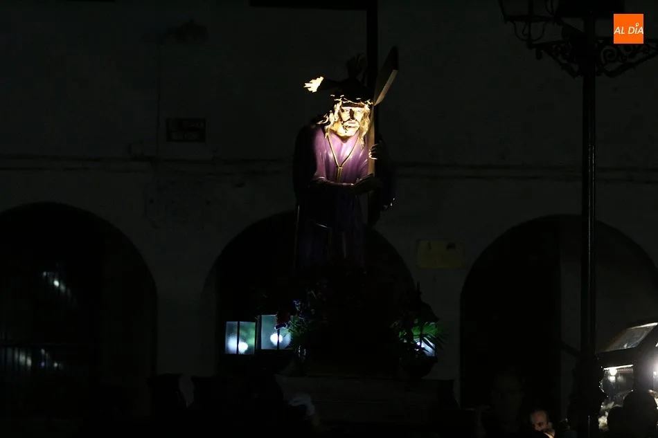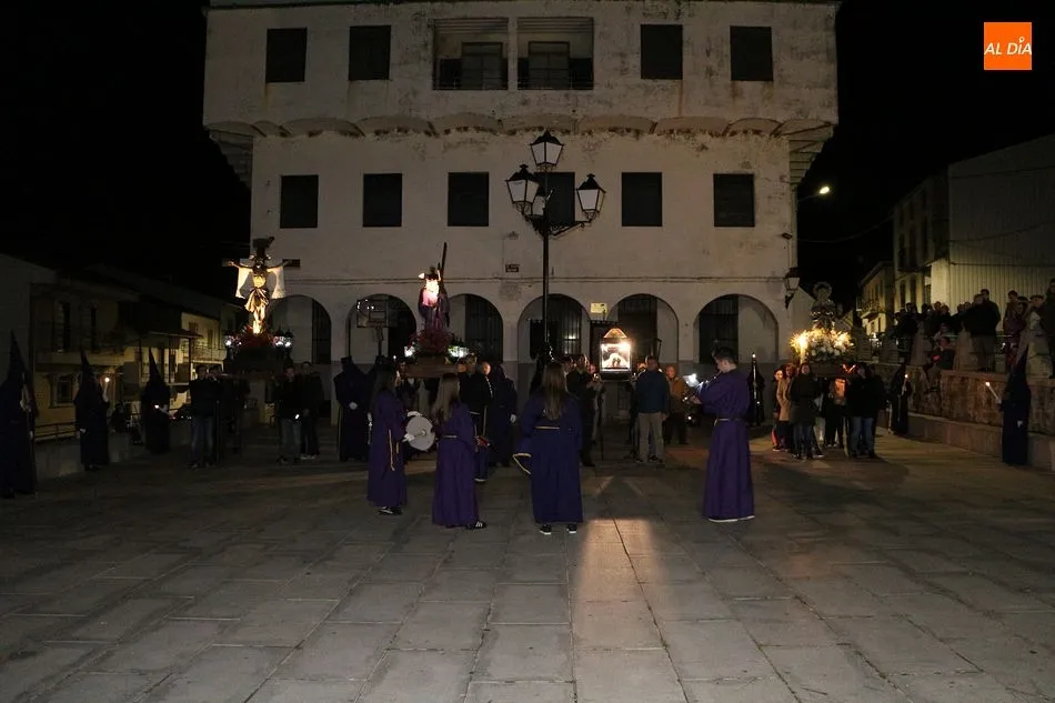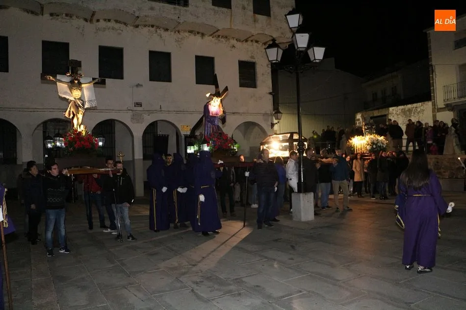 Siguiendo la tradición local, cuando los pasos llegaron a la Plaza Mayor, los cuatro pasos hicieron un alto. Las integrantes del coro parroquial le cantaron un himno a la imagen de La Dolorosa, además de ofrecerse un solo de trompeta a modo de saeta. Acto seguido, dicha imagen fue llevada al encuentro de la imagen de Cristo Crucificado, que fue levantado en vilo por sus portadores. La segunda parada antes de regresar al templo fue a la altura del Ayuntamiento, desde el cual se pudo oír una saeta, para regresar finalmente al templo local.