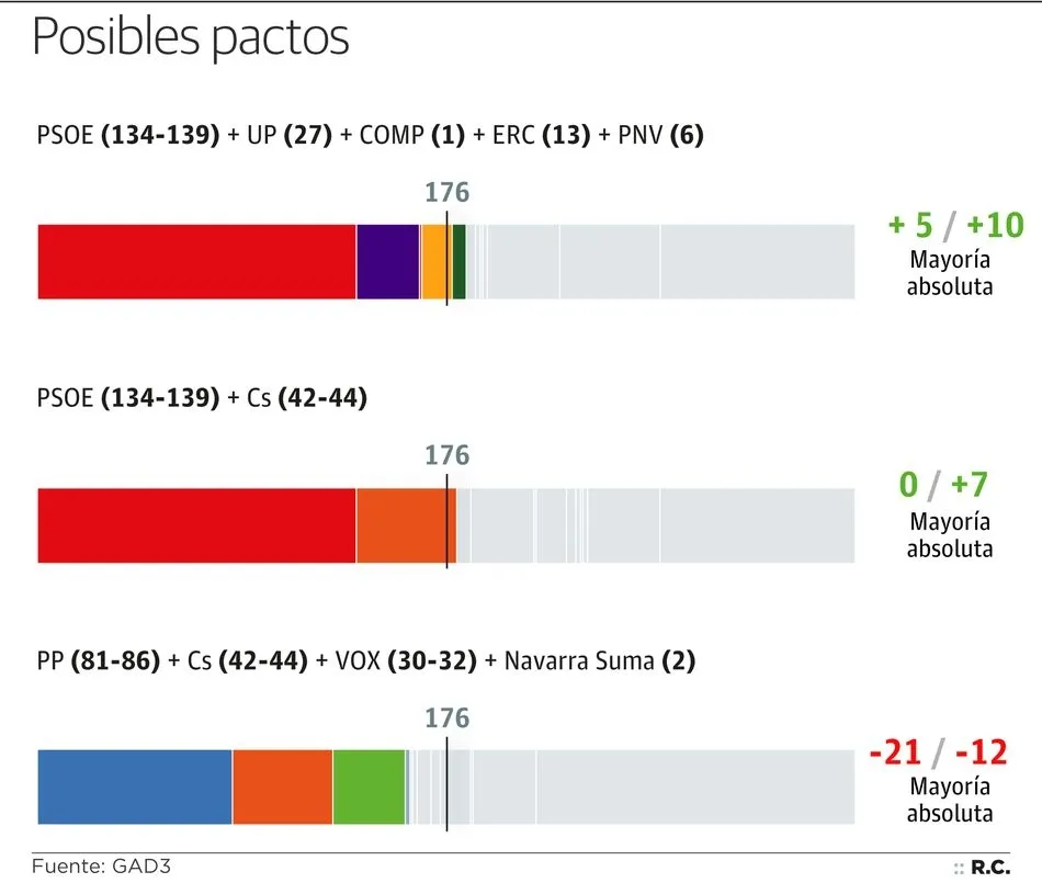 El PSOE ganaría con comodidad, según la encuesta de GAD3 para ?El Norte de Castilla?, y la derecha, pese a que logra más votos, sigue lejos de los 176 escaños de la mayoría absoluta