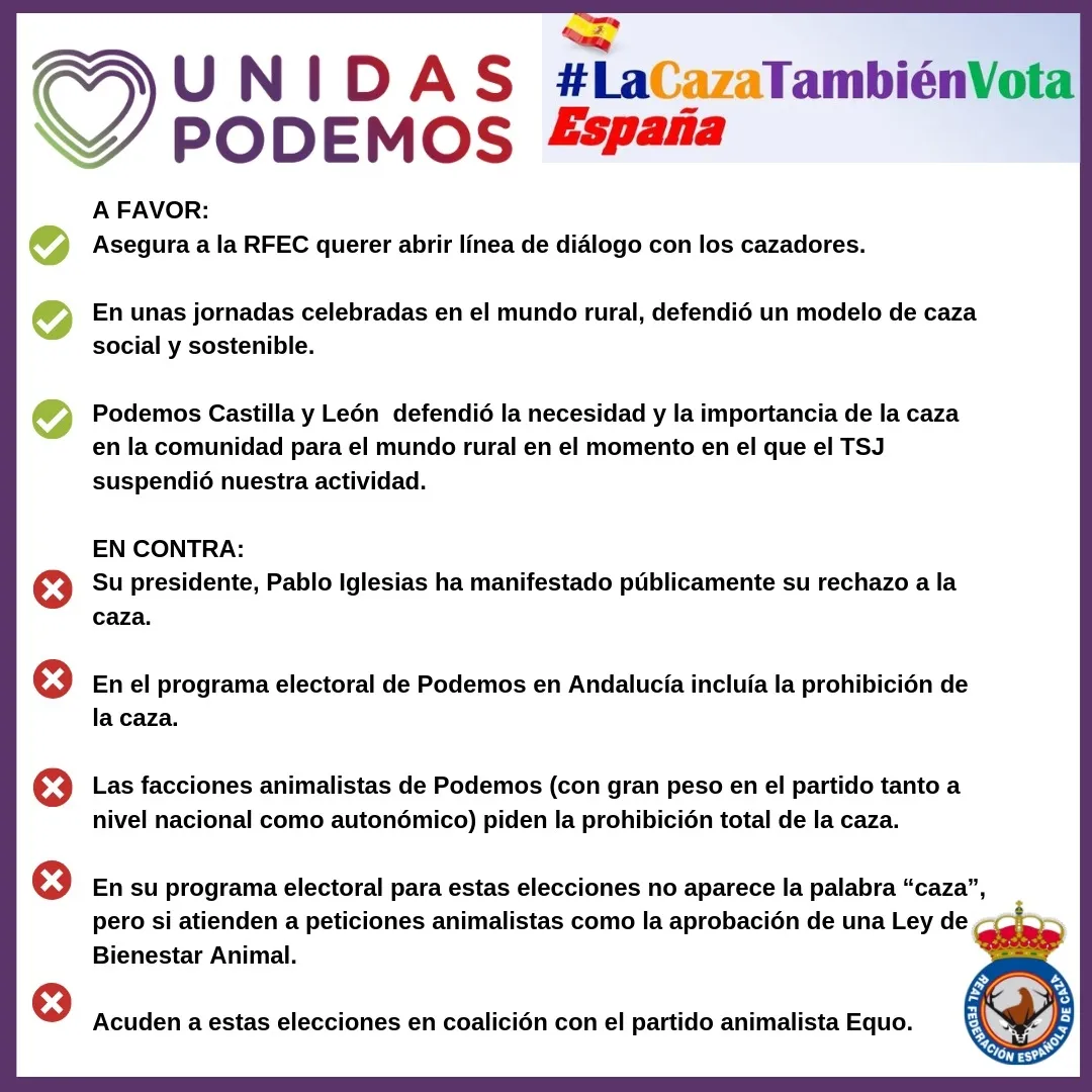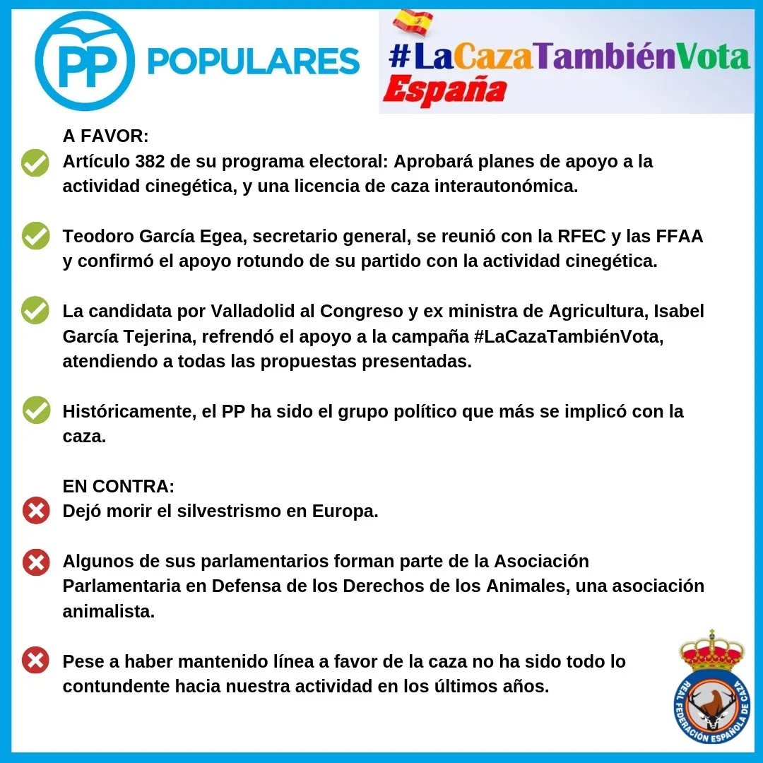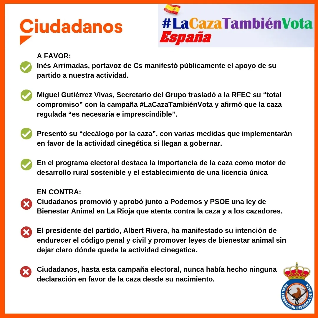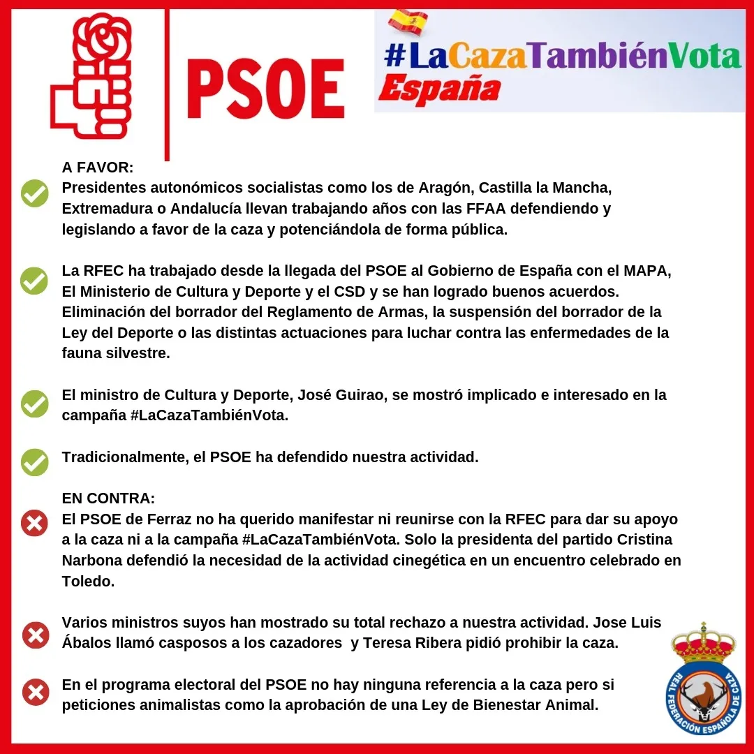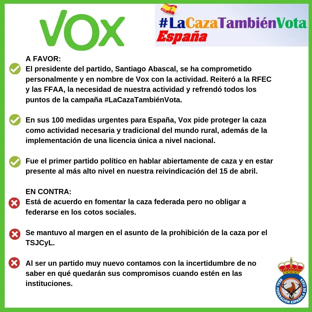 La Real Federación Española de Caza, con motivo de las Elecciones Generales del próximo 28 de abril, ha elaborado estas conclusiones de los resultados de su campaña #LaCazaTambiénVota España puesta en marcha para conocer el compromiso real con la actividad cinegética de los grupos políticos que se presentan a estos comicios.