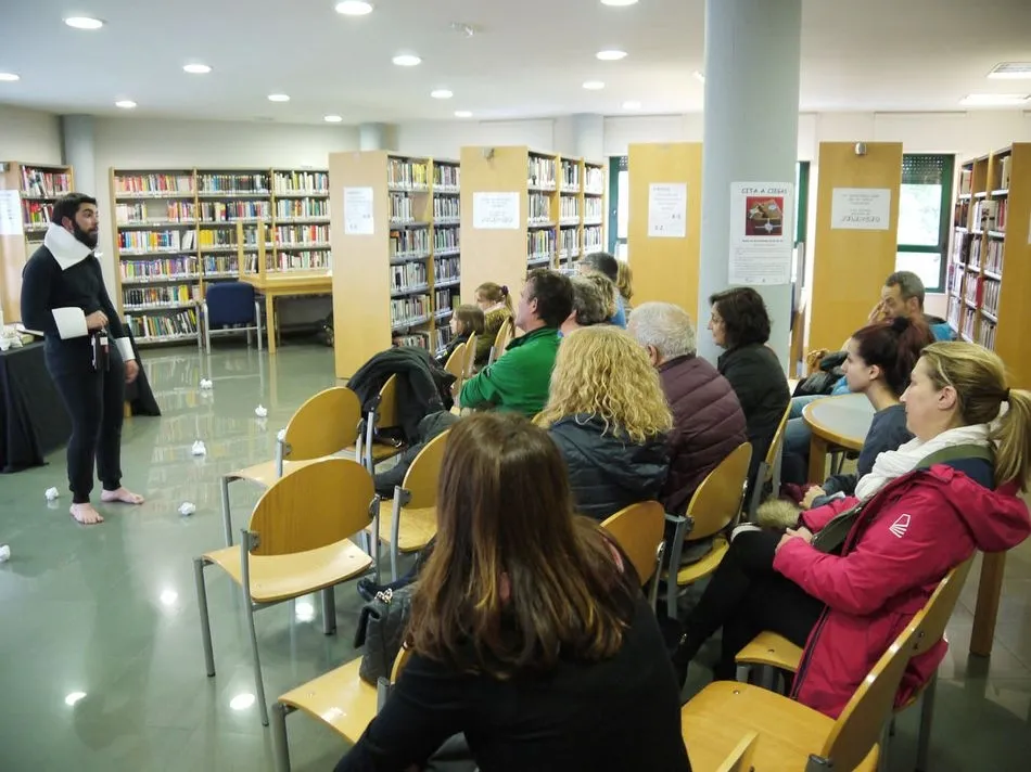 Carbajosa de la Sagrada ha celebrado hoy el día grande de la programación de actividades con motivo del Día del Libro y lo ha hecho con teatro para los escolares por la mañana y microteatro en familia por la tarde. Han tenido lugar dos sesiones de teatro: Teatro de calle con la obra ?Instantes con Cervantes? para los niños de Primaria; y teatro de títeres con ?Bucaneros?, para los alumnos de Infantil de los tres colegios.