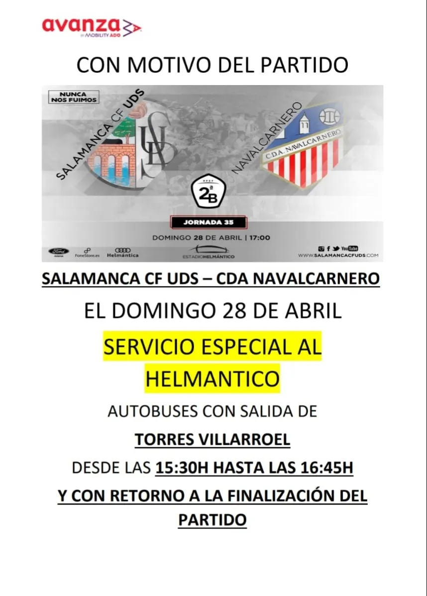 Además, el choque contará con un servicio especial de autobus, al igual que ocurrió el pasado 13 de abril en el derbi ante Unionistas. Las salidas tendrán lugar desde Torres Villaroel de 15:30 a 16:45 horas y con regreso a la finalización del encuentro.