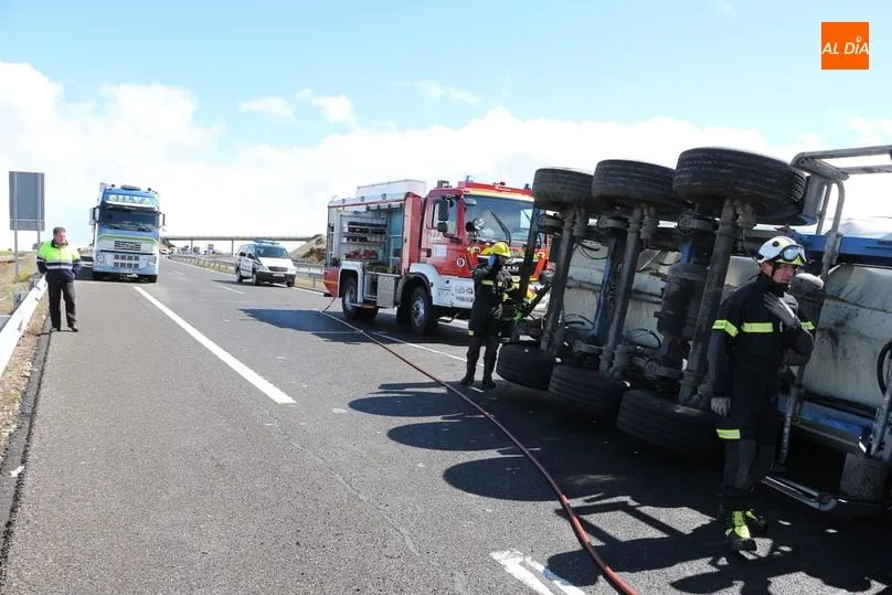 El vuelco de un camión que transportaba vino en la autovía A-66, a la altura de Guijuelo, en dirección Salamanca, ha provocado una gran retención de coches y camiones, en los dos carriles, durante cerca de dos horas. El camión cayó en la calzada ocupando casi en su totalidad los dos carrilles, por lo que se tuvo que interrumpir el tráfico para permitir el trabajo de los servicios de emergencia.
