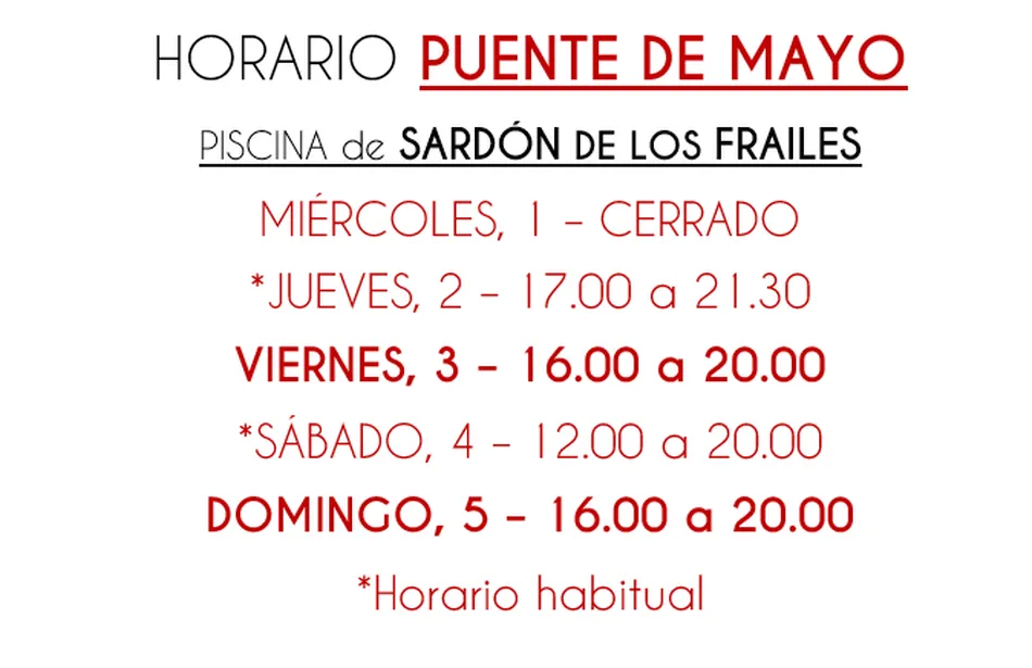 El Ayuntamiento de Sardón de los Frailes ha decidido abrir la piscina de manera continuada los días 2, 3, 4 y 5 de mayo, debido a la festividad del Primero de Mayo, día en el que la piscina estará cerrada.